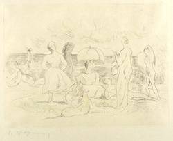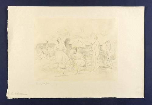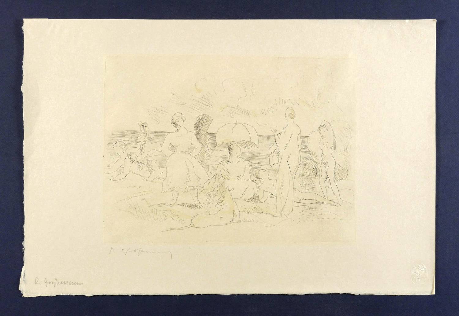 Rudolf Großmann (1882 Freiburg im Breisgau - 1941 Freiburg im Breisgau). Auch Rudolf Grossmann. Deutscher Lithograf und Illustrator in Berlin. Nach einer unregelmäßigen künstlerischen Ausbildung u.a. an der Düsseldorfer Akademie der Künste für einige Zeit in Paris bei Jean Poulerauce und Lucien Simon. Beeinflußt von den Landschaftsdarstellungen Paul Cézannes. Nach seiner Rückkehr nach Deutschland für lange Zeit in Berlin. Mitglied der Berliner Sezession und des Deutschen Künstlerbundes. Es entsteht eine ihm eigene Synthese zwischen Impressionismus und Expressionismus. 1928-34 Professor an der Kunsthochschule Berlin. Galt im NS-Regime als "entarteter Künstler".
