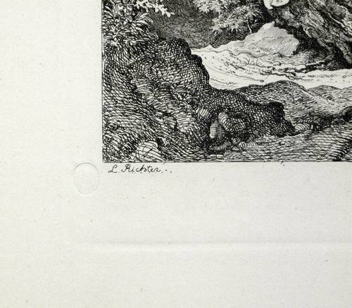 Adrian Ludwig Richter (1803 Dresden - 1884 Dresden). Bedeutender Maler, Zeichner und Grafiker der deutschen Romantik und des Biedermeier. Sohn des Zeichners und Kupferstechers Carl August Richter. Nach der Schulzeit begann er 1815 als Lehrling seines Vaters, studierte daneben an der Kunstakademie in Dresden. 1820/21 begleitete er den russischen Fürst Narischkin als Zeichner auf einer Reise nach Paris. 1823-26 reiste er nach Italien, wo er unter anderen mit Joseph Anton Koch und Julius Schnorr von Carolsfeld zusammentraf. Dies prägte seine idealistisch-harmonische Landschaftsauffassung. 1828-35 lehrte er an der Zeichenschule der Porzellanmanufaktur in Meißen, wo Gottfried Pulian zu seinen Schülern zählte. 1826 wurde er als Lehrer für Lasndschaftsmalerei an die Dresdner Kunstakademie berufen. Für die Reihe „Das malerische und romantische Deutschland“ des Leipziger Verlegers Georg Wigand schuf er die Ansichten für die Bände zu Harz, Franken und Riesengebirge. In den späten 1830er Jahren begann er mit Holzschnitt-Illustrationen für Bücher, die ihn unter einem größeren Laienpublikum in Deutschland bekannt machten. Schließlich wurde er zum Professor für Landschaftsmalerei in Dresden ernannt. 1873 musste er aufgrund eines Augenleidens mit dem Malen aufhören und schied 1876 aus der Kunstakademie in Dresden aus.