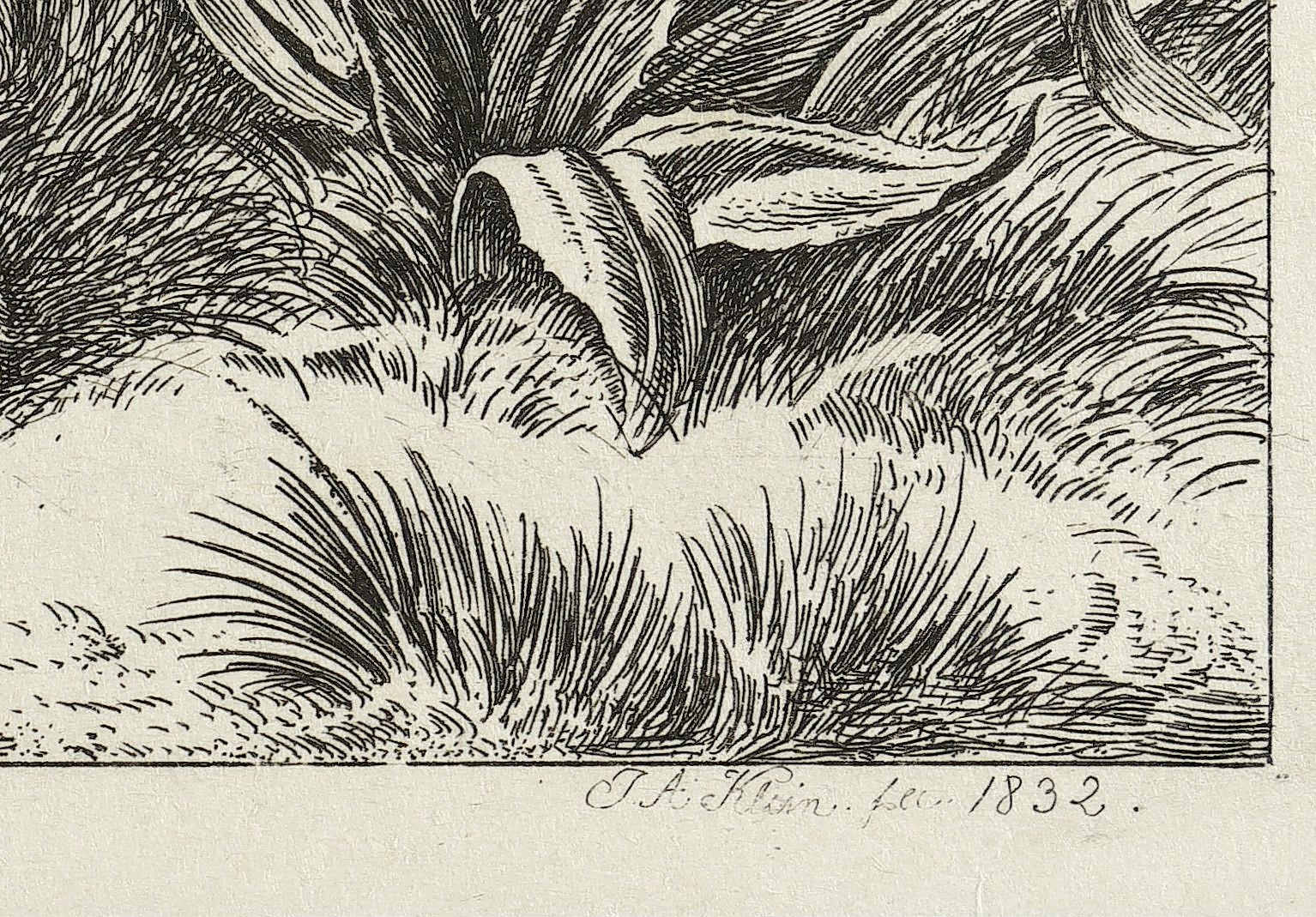 Johann Adam Klein (1792 Nürnberg - 1875 München). Deutscher Maler und Radierkünstler des Biedermeier. Erster Zeichenunterricht mit 8 Jahren bei dem Maler Georg Christoph von Bemmel. Ab 1805 Lehrling im Atelier des Kupferstechers Ambrosius Gabler. 1811 Schüler der von Gustav Philipp Zwinger geleiteten Nürnberger Zeichenschule. 1811-18 Studium an der Kunstakademie in Wien. Während einer Reise an Rhein und Main 1815 Begegnung mit dem Werk des Malers Wilhelm von Kobell. 1818 Reise ins Salzkammergut mit Johann Christoph Erhard, den Brüdern Friedrich Philipp und Heinrich Reinhold und Ernst Welker. 1819/20 Italienaufenthalt. 1839 Umsiedelung nach München und Heirat der Tochter des Kupferstechers Wolf. Mit seinen zahlreichen Tierstücken zählt Klein zu den wichtigsten Radierkünstlern des frühen 19. Jahrhunderts.