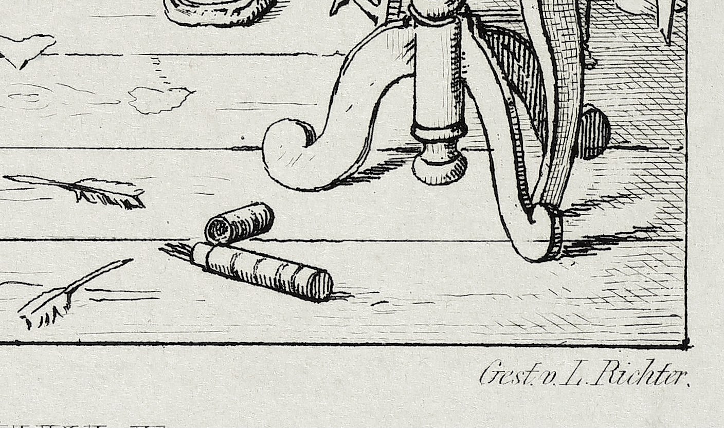 Adrian Ludwig Richter (1803 Dresden - 1884 Dresden). Bedeutender Maler, Zeichner und Grafiker der deutschen Romantik und des Biedermeier. Sohn des Zeichners und Kupferstechers Carl August Richter. Nach der Schulzeit begann er 1815 als Lehrling seines Vaters, studierte daneben an der Kunstakademie in Dresden. 1820/21 begleitete er den russischen Fürst Narischkin als Zeichner auf einer Reise nach Paris. 1823-26 reiste er nach Italien, wo er unter anderen mit Joseph Anton Koch und Julius Schnorr von Carolsfeld zusammentraf. Dies prägte seine idealistisch-harmonische Landschaftsauffassung. 1828-35 lehrte er an der Zeichenschule der Porzellanmanufaktur in Meißen, wo Gottfried Pulian zu seinen Schülern zählte. 1826 wurde er als Lehrer für Lasndschaftsmalerei an die Dresdner Kunstakademie berufen. Für die Reihe „Das malerische und romantische Deutschland“ des Leipziger Verlegers Georg Wigand schuf er die Ansichten für die Bände zu Harz, Franken und Riesengebirge. In den späten 1830er Jahren begann er mit Holzschnitt-Illustrationen für Bücher, die ihn unter einem größeren Laienpublikum in Deutschland bekannt machten. Schließlich wurde er zum Professor für Landschaftsmalerei in Dresden ernannt. 1873 musste er aufgrund eines Augenleidens mit dem Malen aufhören und schied 1876 aus der Kunstakademie in Dresden aus.