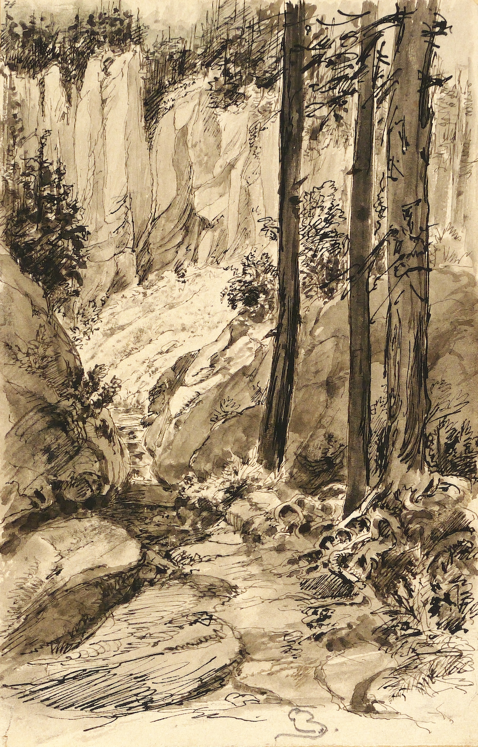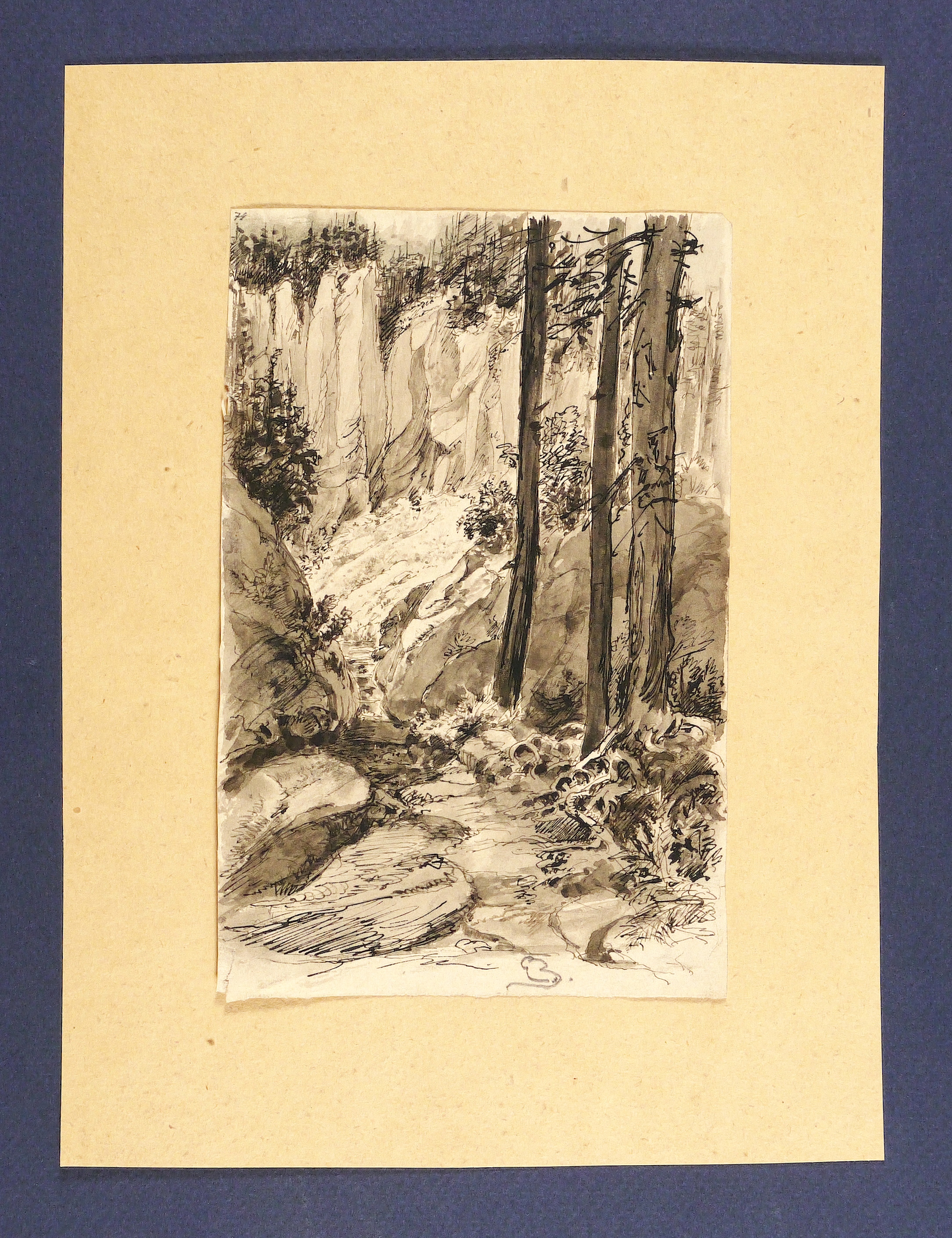 Um 1875. Zeichnung / Federzeichnung, in schwarzer Tusche, grau laviert. – Originale Künstlergrafik, von Franz Emil Zeising. – Unikat. – 15,2 x 9,8 cm (Blatt), 21,5 x 16 cm (Trägerkarton).