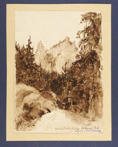 Rechts unten in brauner Feder bezeichnet und datiert: ″Waldschloss 18 Juni 83.″ Dazu Nachlass-Stempel Emil Zeising. – Sehr gut erhalten. Mit Papiergelenken auf Trägerkarton montiert.