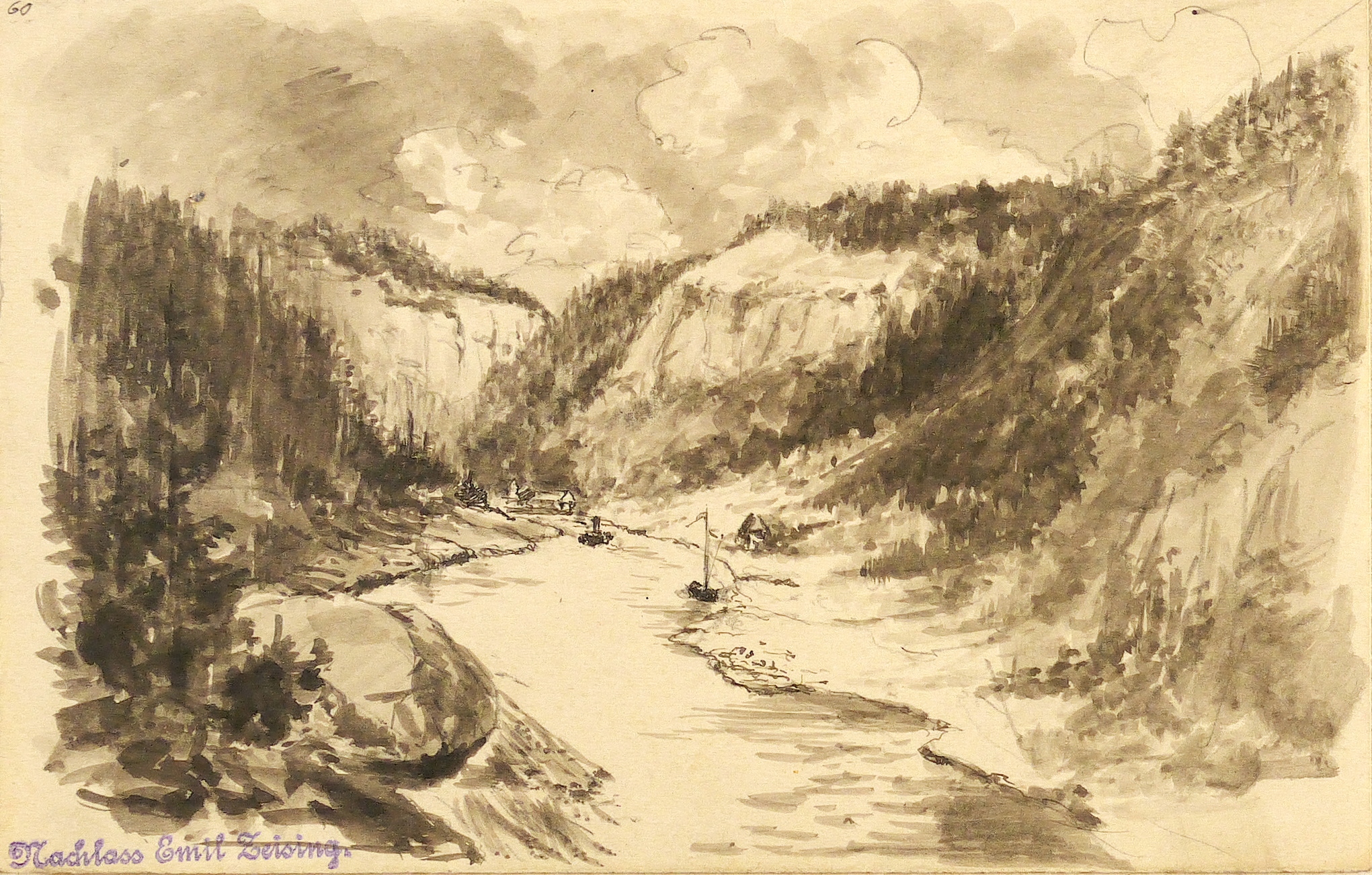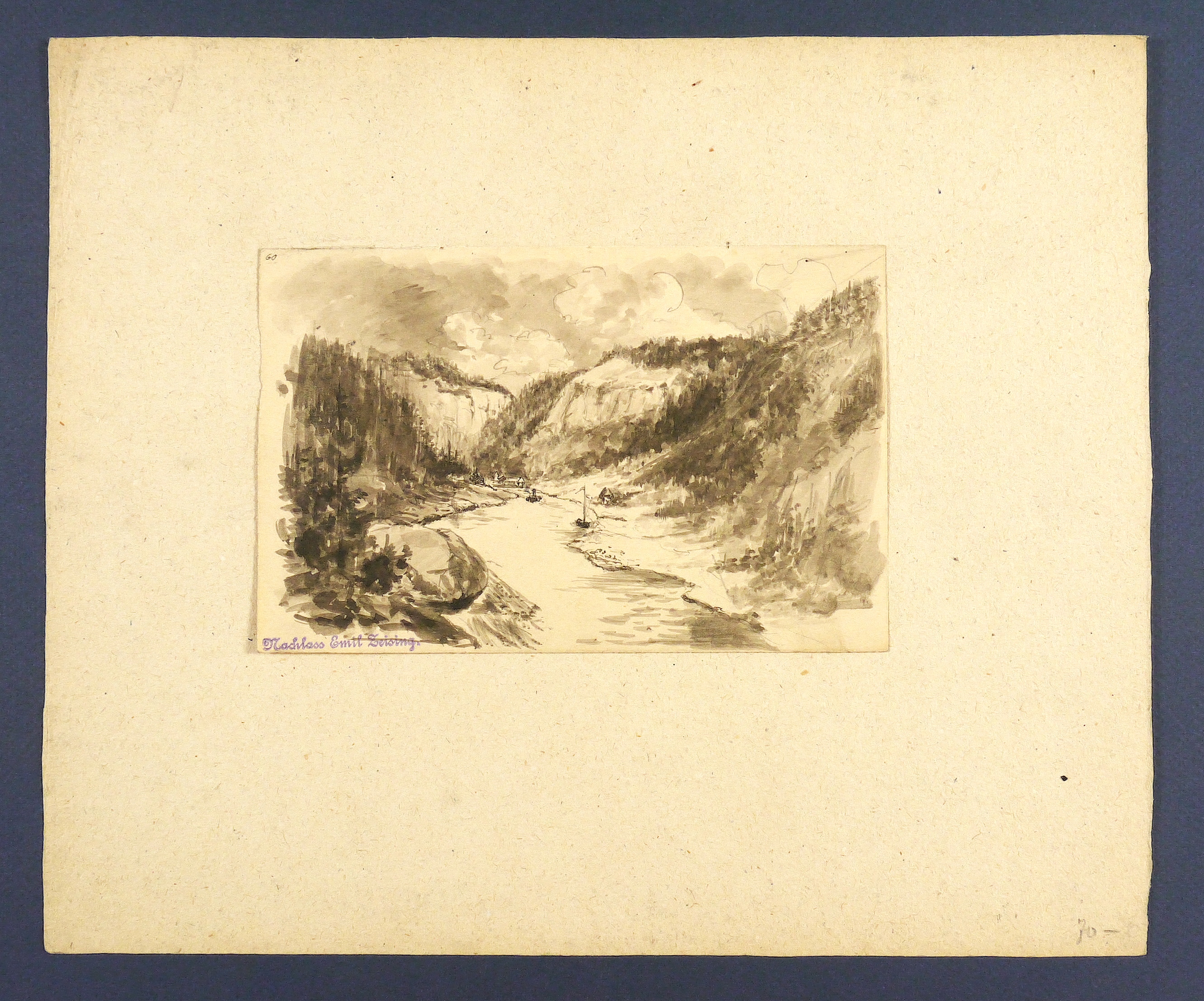 Um 1880. Zeichnung / Federzeichnung, in schwarzer Tusche, grau laviert, auf gelbem Velin. – Originale Künstlergrafik, von Franz Emil Zeising. – Unikat. – 10,6 x 16,3 cm (Darstellung / Blatt), 24 x 29 cm (Trägerkarton).