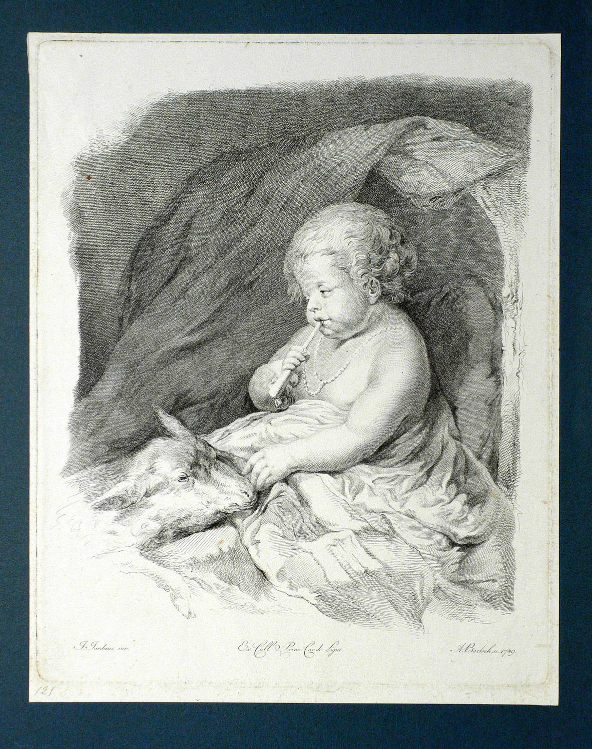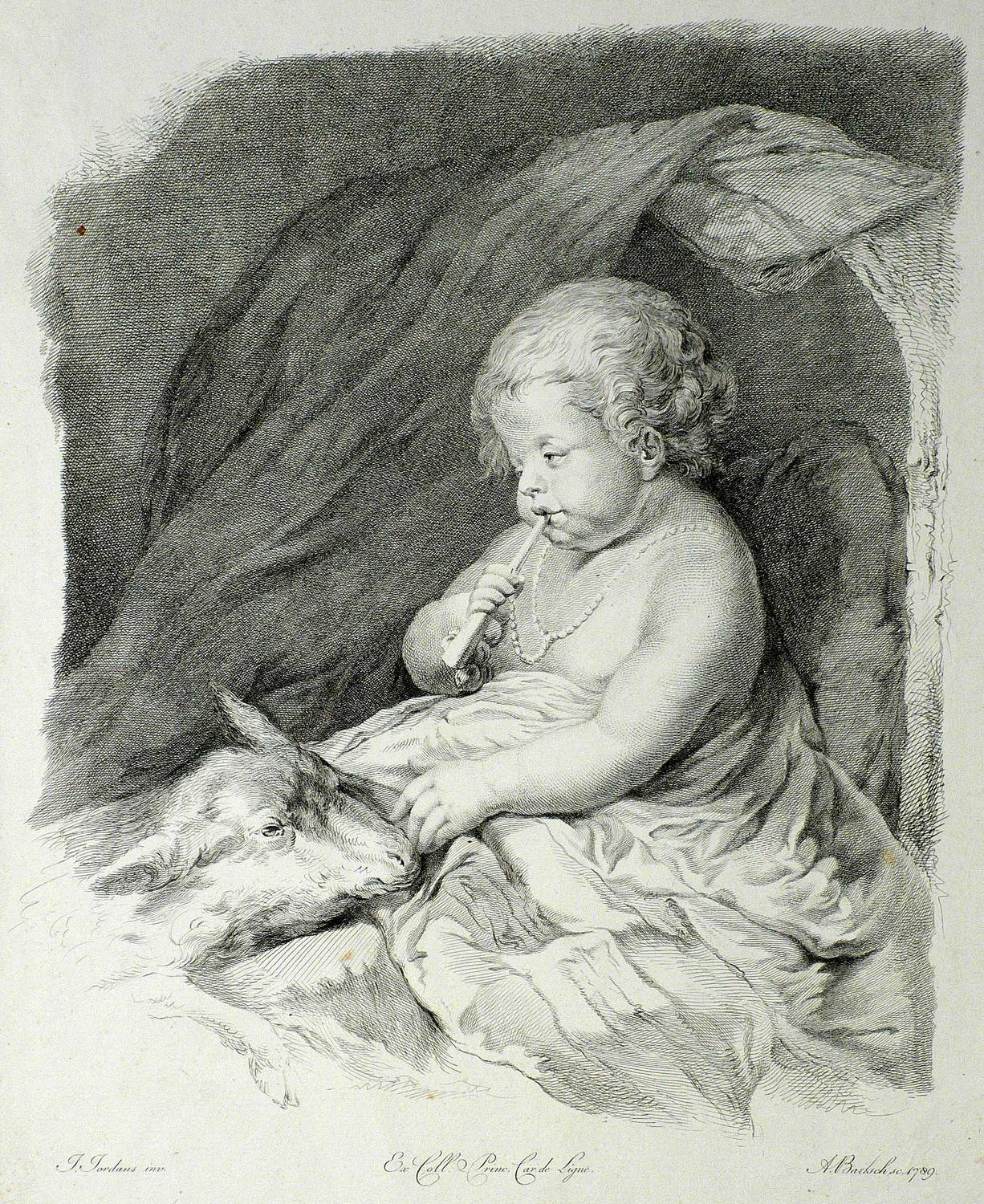 In der Platte rechts unten signiert und datiert: ″A. Bartsch sc. 1789.″ Mittig weiter bezeichnet: ″Ex Coll. Princ. Car. de Ligne.″ Verso Notationen in Bleistift, u.a.: ″B121″. – Mit schmalem Rand um die Platte. Marginal felckig und bisweilen schwach knickspurig. Weitgehend ausgelegene diagonale Lagerfalte. Insgesamt mäßig guter bis guter Zustand.