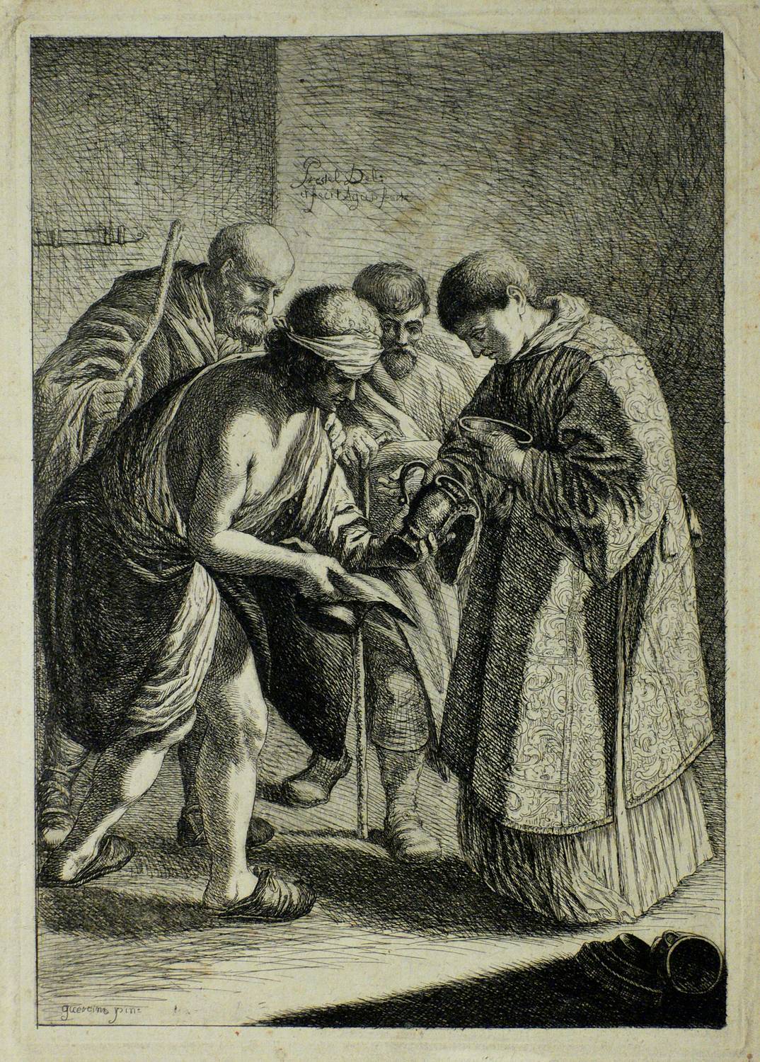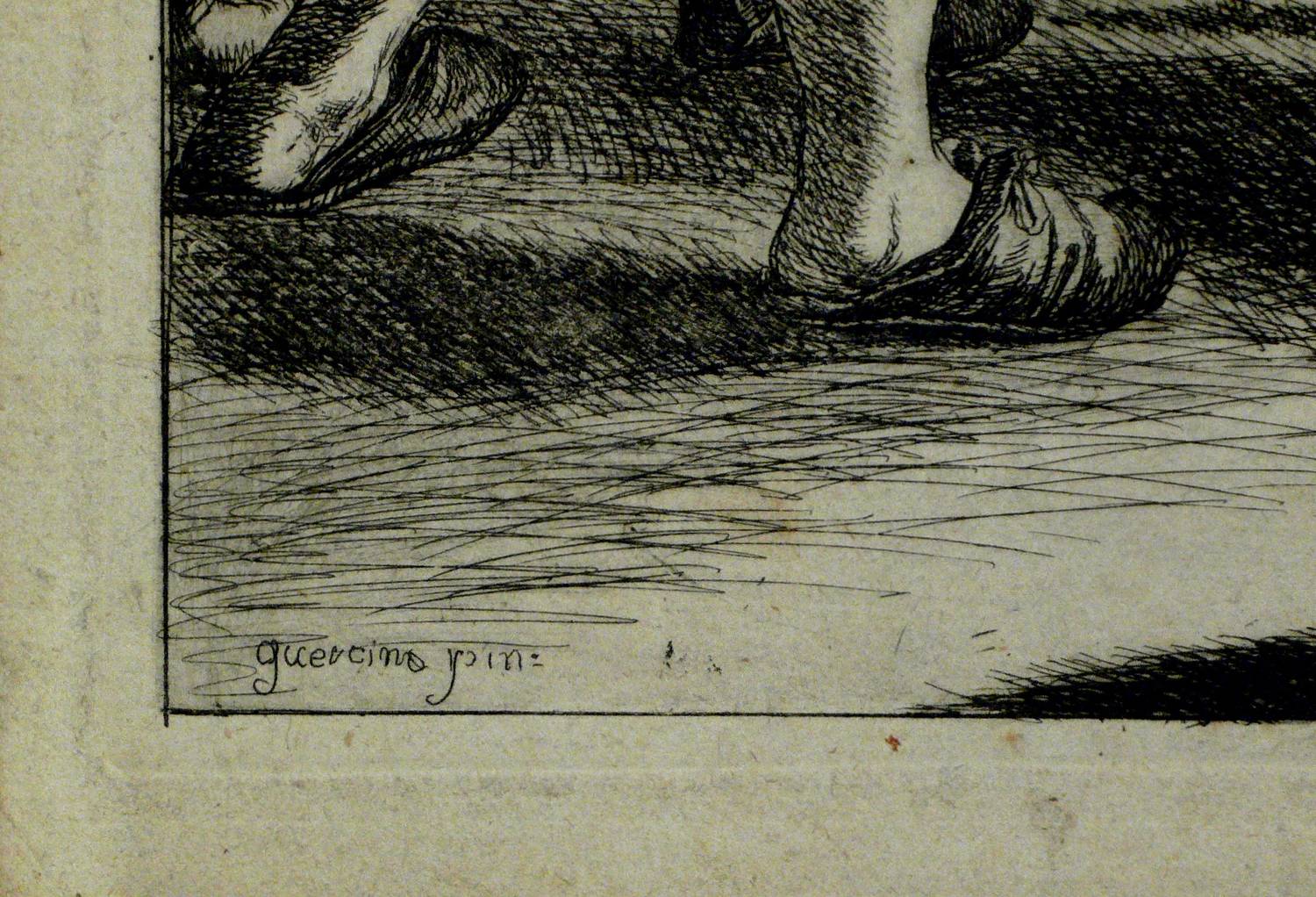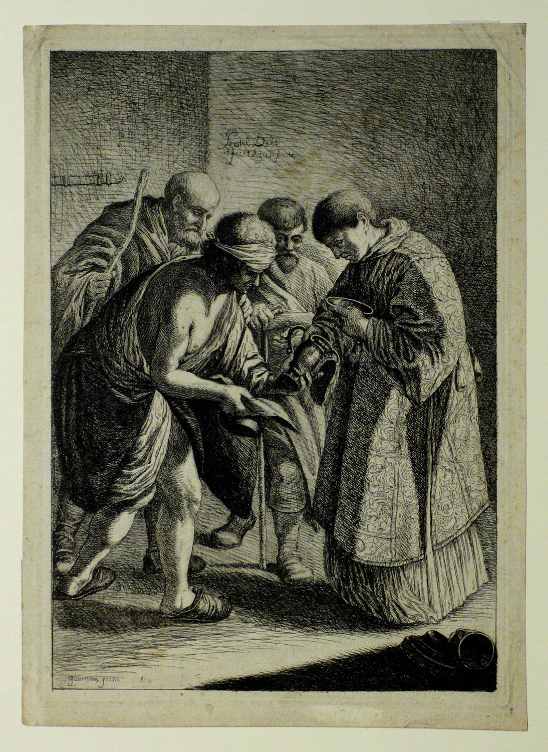In der Platte innerhalb der Darstellung oben signiert: ″Prestel Del. / et fecit Aqu. forte″. Unten links bezeichnet: ″Guercino pin.″ – Schmaler Rand um die Platte. Papier etwas angeschmutzt, im Rand bisweilen leicht knickspurig und berieben. Insgesamt aber dem Alter entsprechend noch guter Zustand.