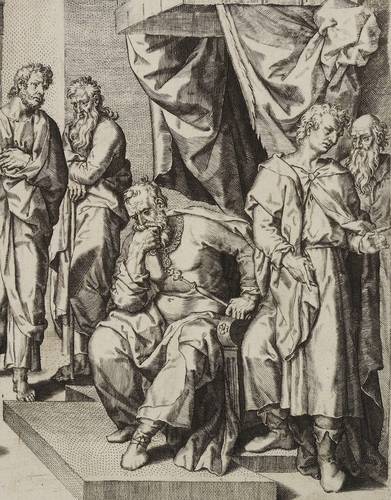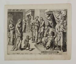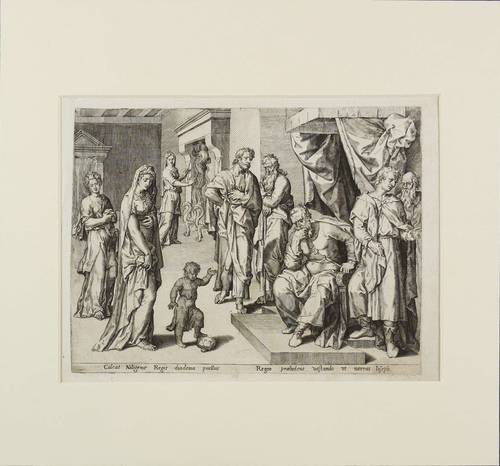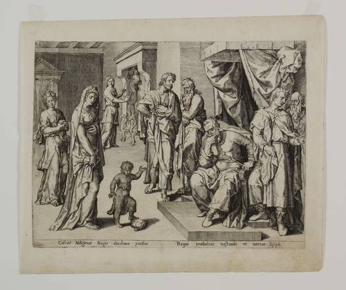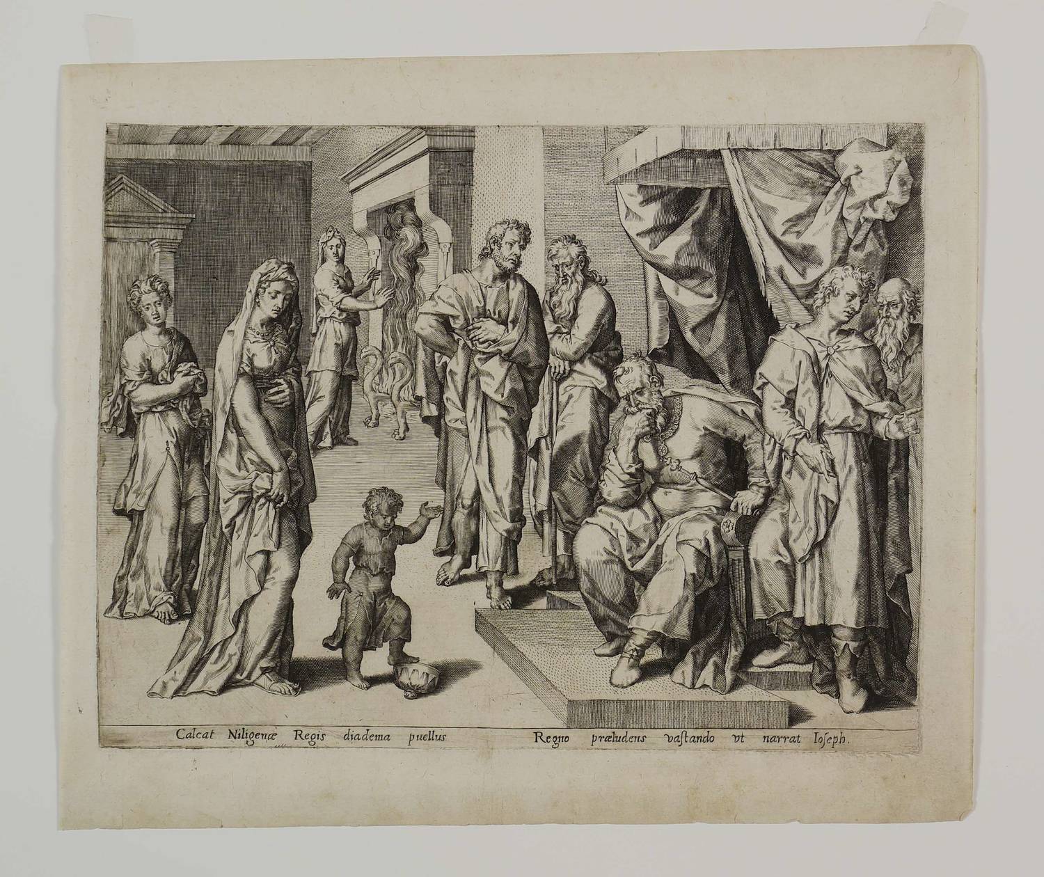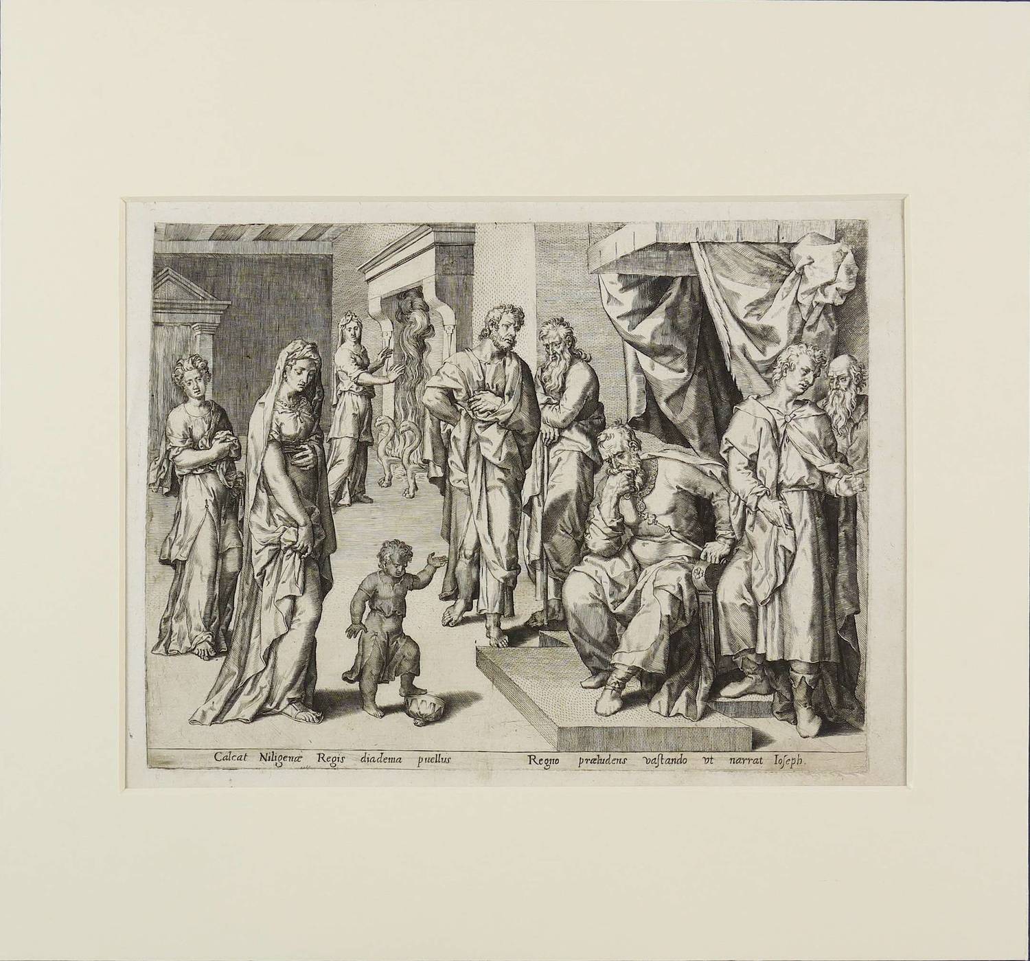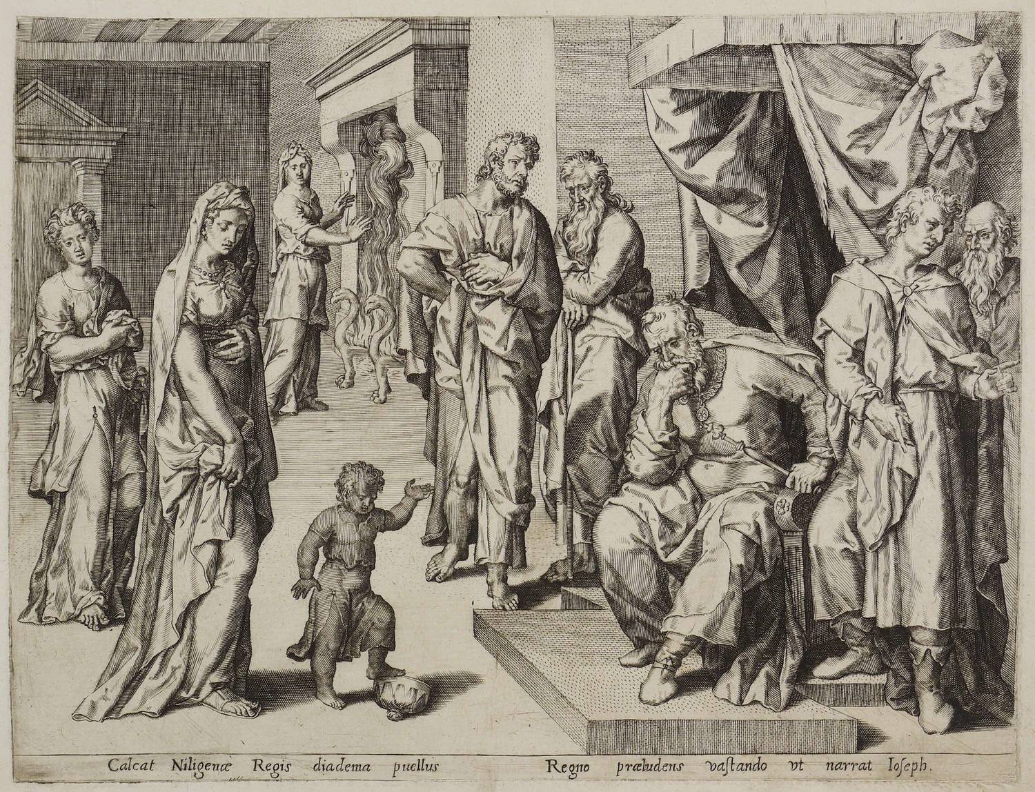 Unterhalb der Darstellung lateinische Inschrift: ″Calcat Niligenae Regis diadema puellus. // Regno praeludens vastando ut narrat Joseph″. – Es handelt sich mutmaßlich um einen Meister der Antwerpener Schule, etwa aus dem Umkreis von Johannes und Anton Wierix. – Blatt in Passepartout montiert. Dem Alter entsprechend guter Zustand.