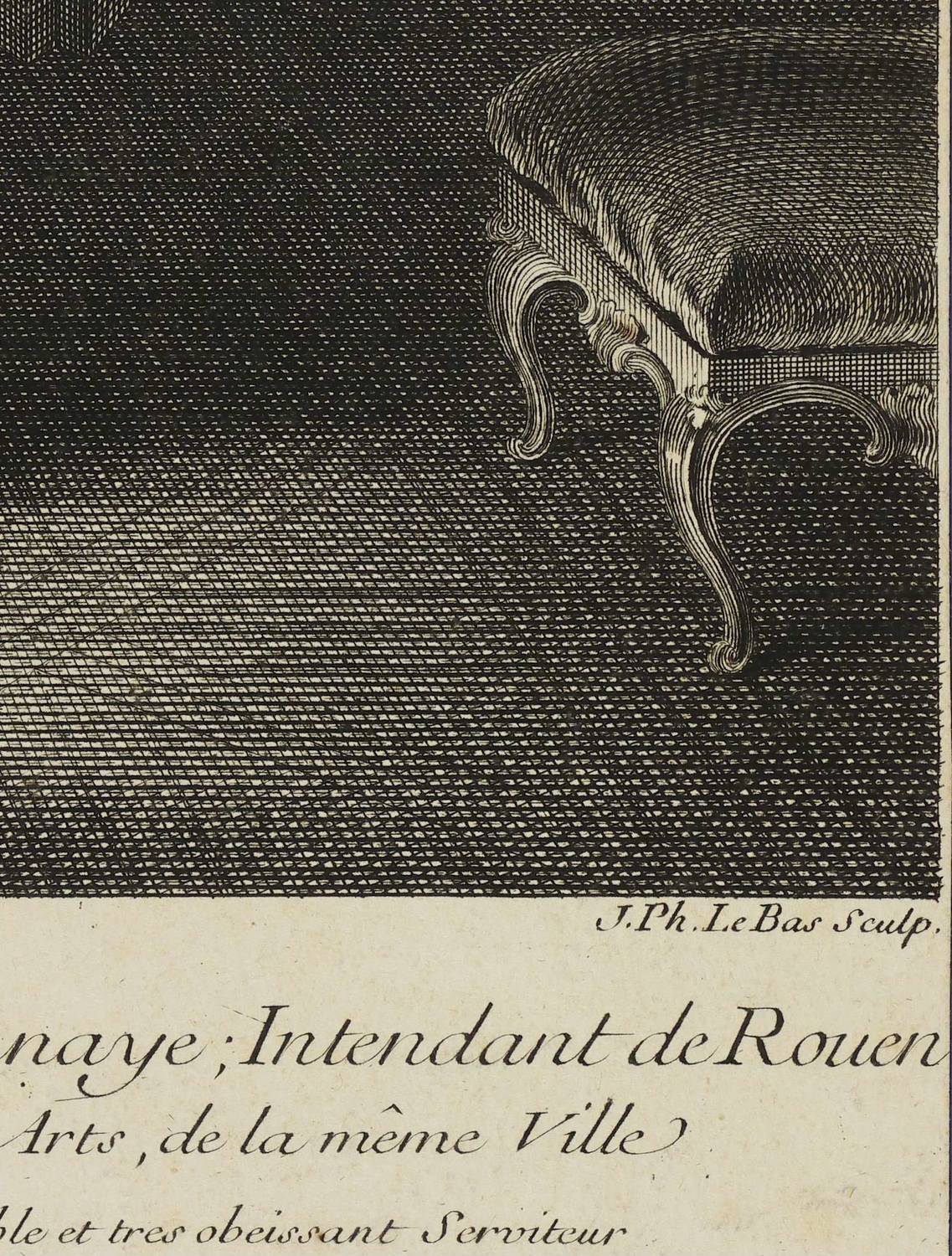 Rechts unterhalb der Darstellung signiert, mittig darunter betitelt. Verlegeradresse: Jacques Philippe Le, Bas Paris. Mit einer Widmung an Marquis de La Bourdonnaye. – Blatt bis auf die Plattenkante beschnitten und verso mit Resten vormaliger Montierung. Insgesamt aber dem Alter entsprechend guter Erhaltungszustand.