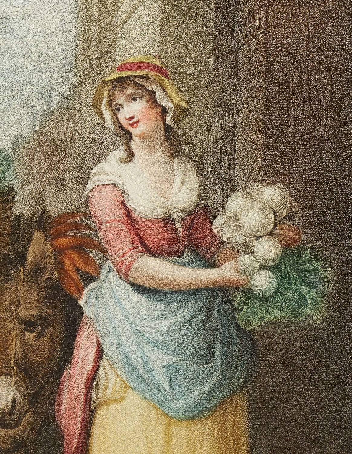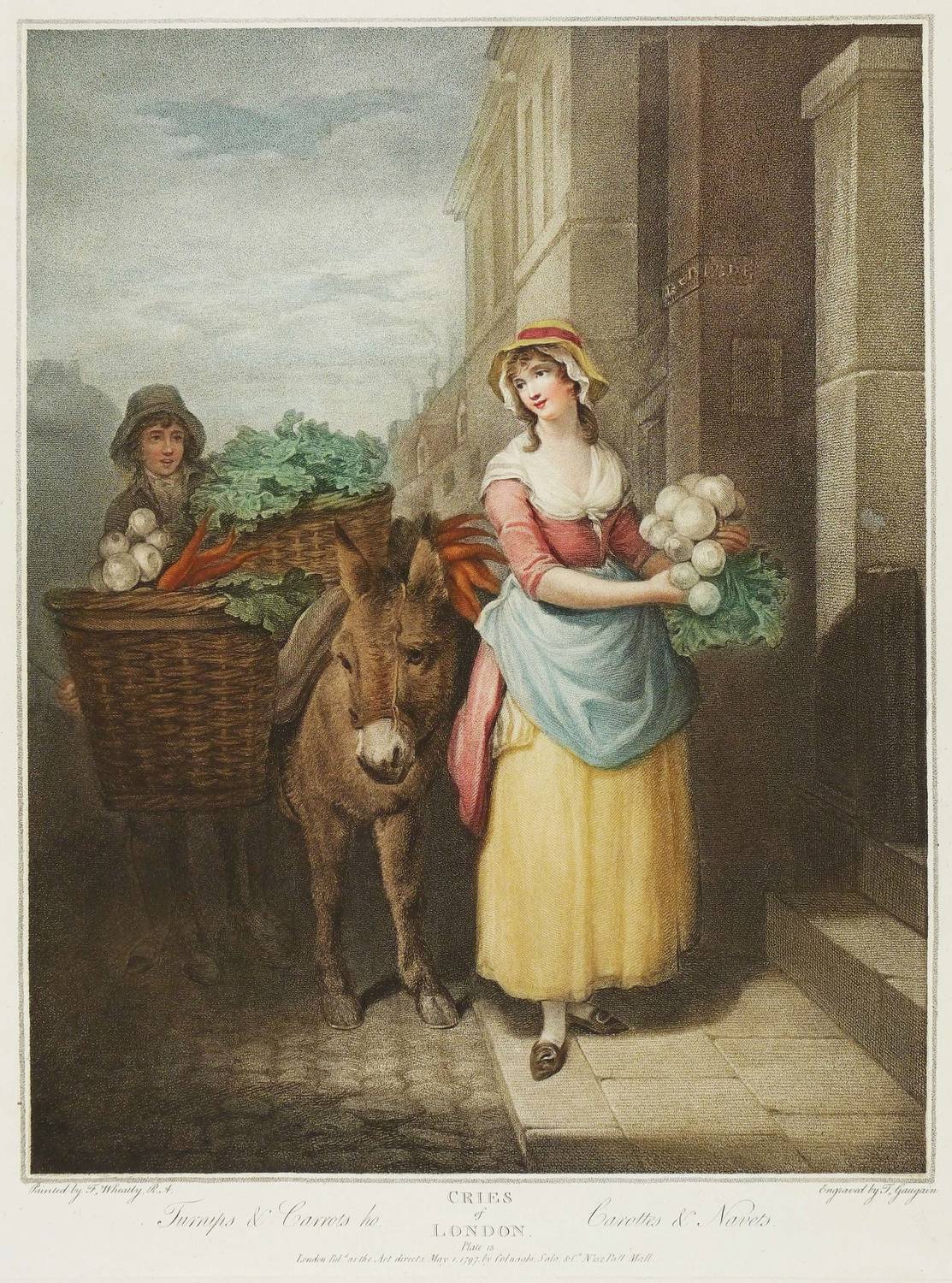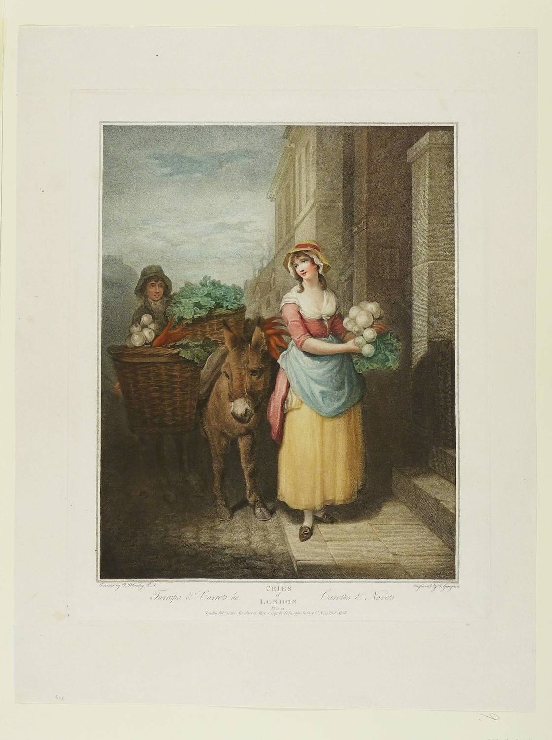 In der Platte unterhalb der Darstellung in Englisch und Fanzösisch betitelt sowie rechts unten signiert: ″Engraved by T. Gaugain″. Unten Verlegeradresse und Datierung: ″May 1. 1797. by Colnaghi, Sala & Co.″ – Blatt Nr. 13 und zugleich eines der seltensten und wertvollsten Blätter aus der Folge ″Cries of London″. – Insgesamt sehr schön erhalten. Sehr guter Zustand.