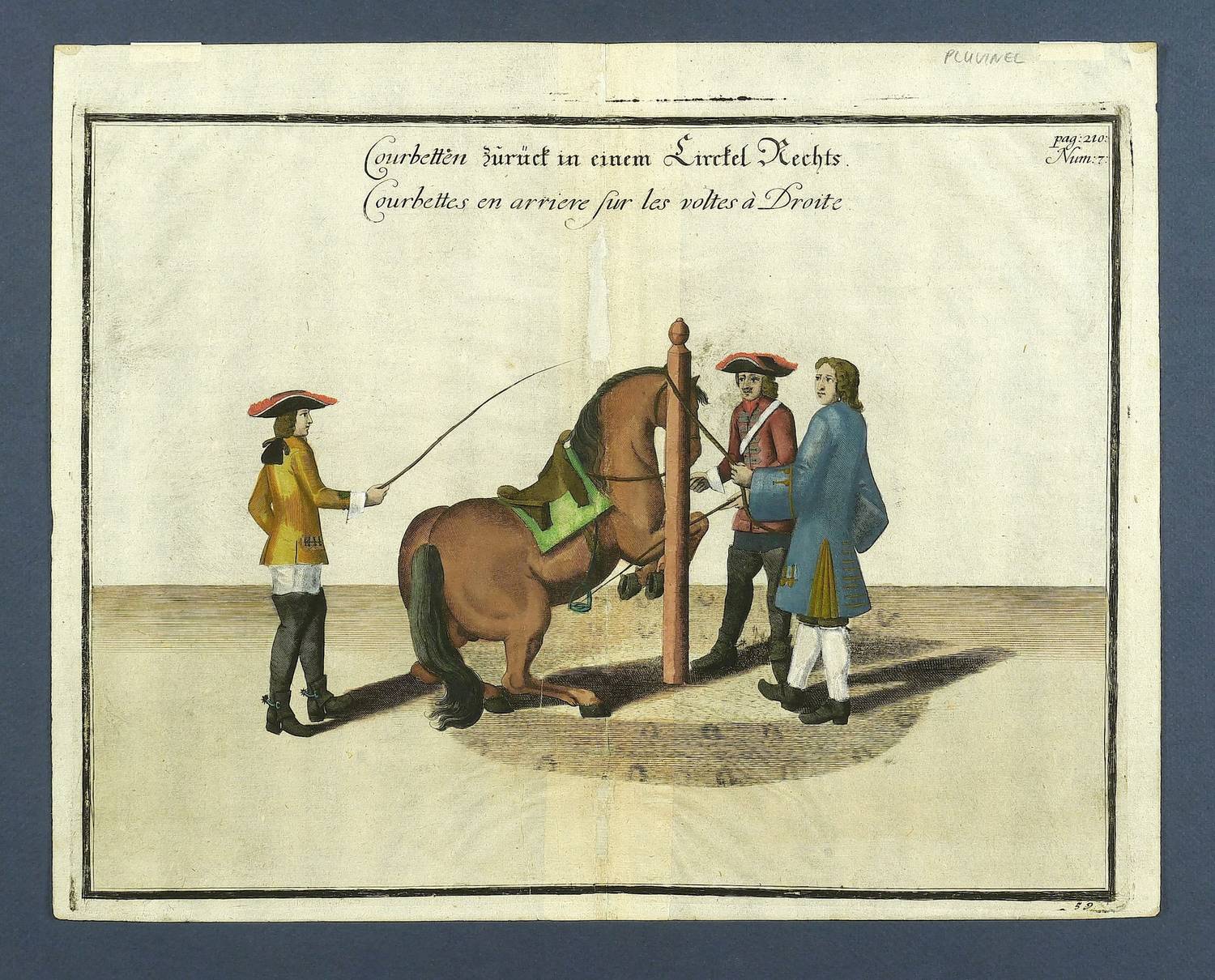Aus: William Cavendish of Newcastle, Wilhelms Herzogs von Neukastel neueröfnete Reitbahn oder vollkommener Stallmeister (Nürnberg: Raspe / Raspische Buchhandlung 1764). – Innerhalb der Darstellung deutsch und französisch betitelt: "Courbetten zurück in einem Circkel Rechts. / Courbettes en arriere sur les voltes à Droite". Nummeriert. – Fehlstellen im Bereich der ehemaligen Bugfalte hinterlegt. Verso Reste vormaliger Montierung. Sonst noch guter Erhaltungszustand mit wohlerhaltenem Kolorit.