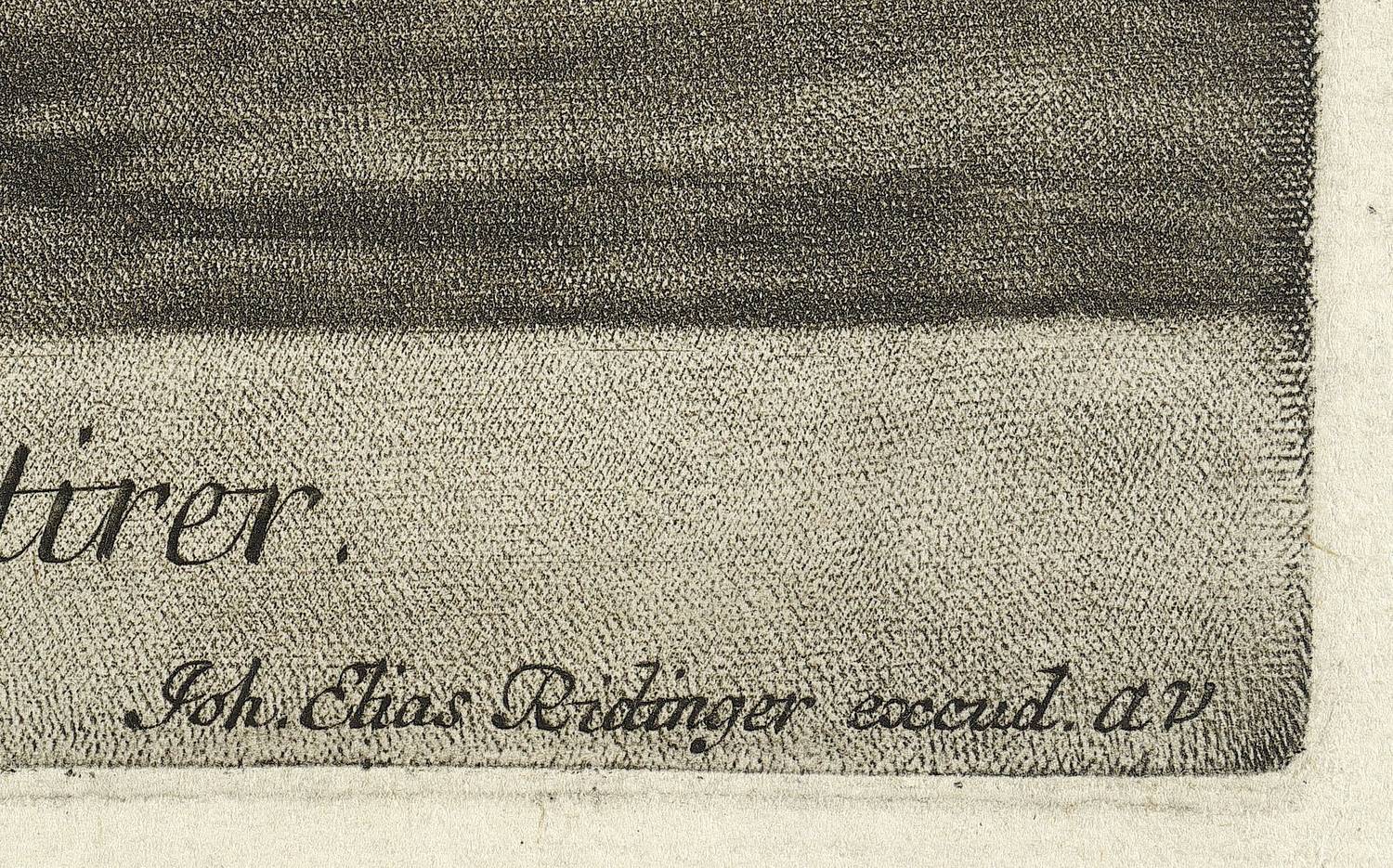 Schwarz 1424. Nicht bei Thienemann. – In der Platte rechts unten signiert: ″Joh. Elias Ridinger excud. AV″. – Mit breitem Rand erhalten. Im Rand oberflächlich berieben und stellenweise etwas fleckig. Insgesamt guter Zustand.