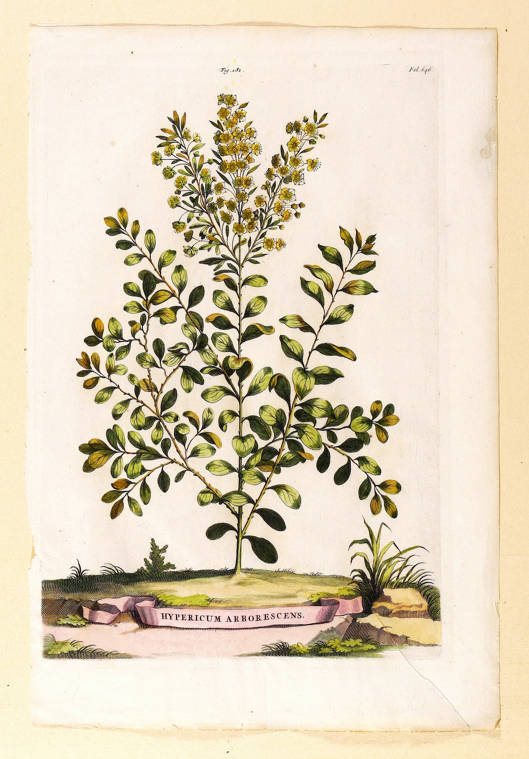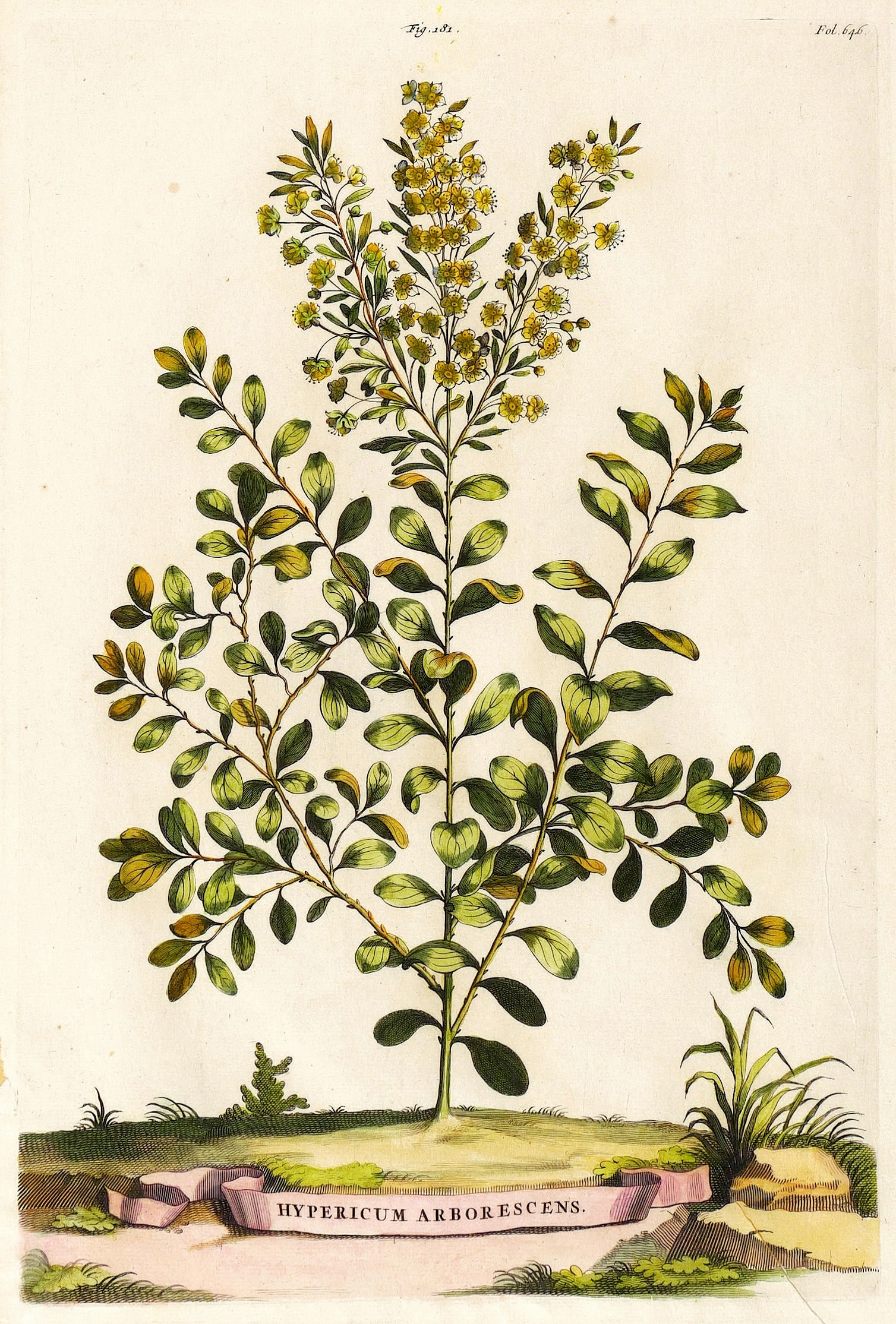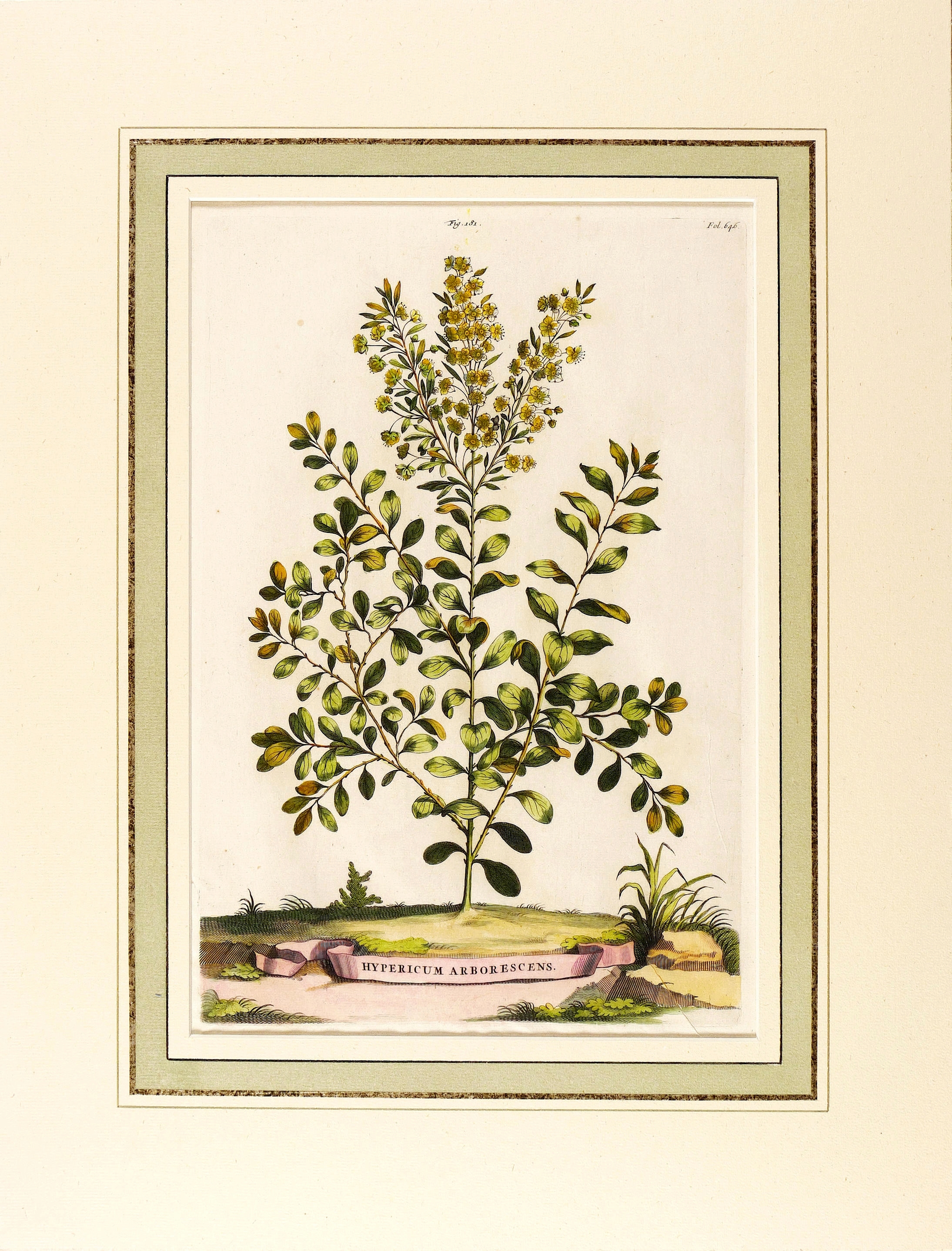 Aus: Abraham Munting, Naauwkeurige Beschryving der Aardgewassen. waar in de veelerley aart en bijzondere eigenschappen der boomen, heesters, kruyden, bloemen met haare vrugten, zaden, wortelen en bollen, neevens derzelver waare voortteeling gelukkige aanwinning, en heylzaame geneeskrachten, na een veel-jarige oeff (Leyden & Utrecht: Pieter van der Aa & Francois Halma 1696). – Auf dem Schriftband in der Darstellung betitelt. Im oberen Plattenrand nummeriert. – Die dargestellte Pflanze wird heute als Hypericum chapmanii W.P. Adams bezeichnet. – Blatt in ein Passepartout montiert und leicht randrissig. Fleck im rechten Rand. Dem Alter entsprechend guter Zustand.