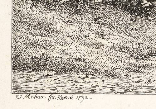 Nagler 8. – In der Platte links unten signiert: ″J. Mechau fec. Romae 1792.″ Mittig Titel. – Blatt aus der Folge ″Malerisch radirte Prospekte von Italien″ (1792-1798). – Papier oberflächlich schwach angeschmutzt und partiell gering fleckig. Insgesamt mäßig guter Erhaltungszustand.