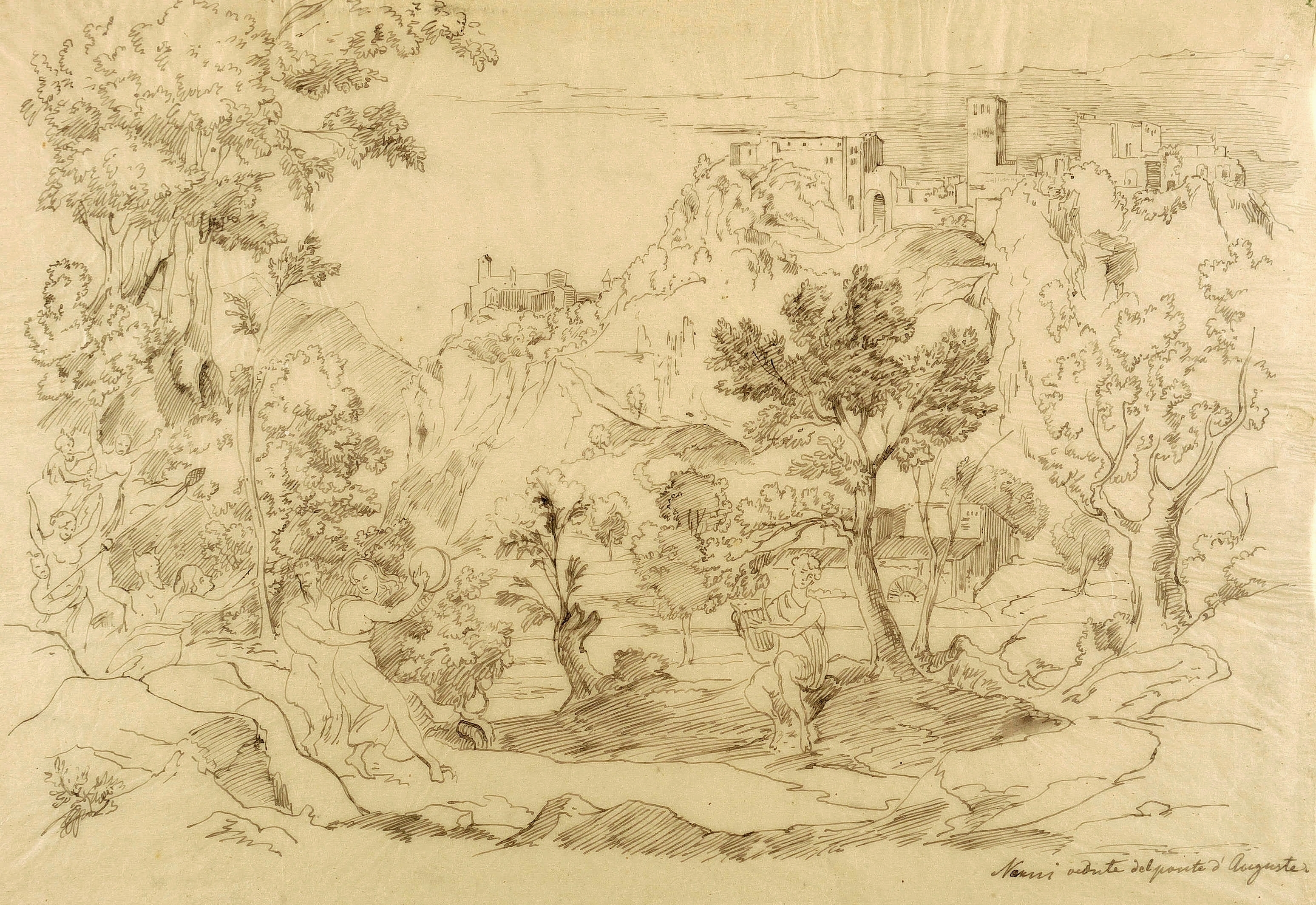 Nicht bei Lutterotti. – Rechts unten in schwarzer Feder bezeichnet: ″Narni / vedute del ponte d'Auguste.″ – Dionysischer Zug mit Satyrn und Mänaden sowie zentral ein Lyraspieler im Tal der Nera unterhalb der Stadt Narni. Die Ruinen des Ponte Augusto sind nicht direkt wiedergegeben. Die Bezeichnung meint wohl eher den ungefähren Standort der Landschaftsaufnahme, weniger das tatsächlich Dargestellte. - Vgl. die Zeichnung ″Blick auf Narni mit Zug tanzender Bacchanten und Leierspieler″ in Koch's Skizzenbuch in der Akademie der Bildenden Künste Wien (Lutterotti SB 911, 111). – Alt mit kleinen Klebepunkten im Rand auf Trägerpapier gesetzt. Dieses rückseitig mit Resten weiterer Klebemontierungen und Papiergelenken. Das feine Papier gelegentlich etwas gewellt. Insgesamt aber in schöner Erhaltung.