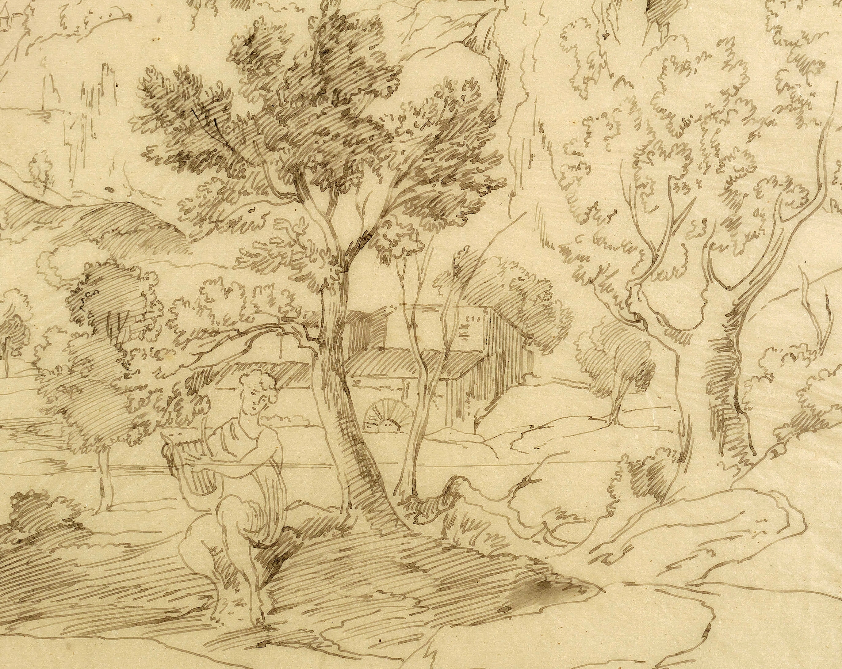 Um 1819. Zeichnung / Federzeichnung, auf transparentem dünnem Papier. – Originale Künstlergrafik, von Joseph Anton Koch. – Unikat. – 22,9 x 33,2 cm (Darstellung / Blatt).