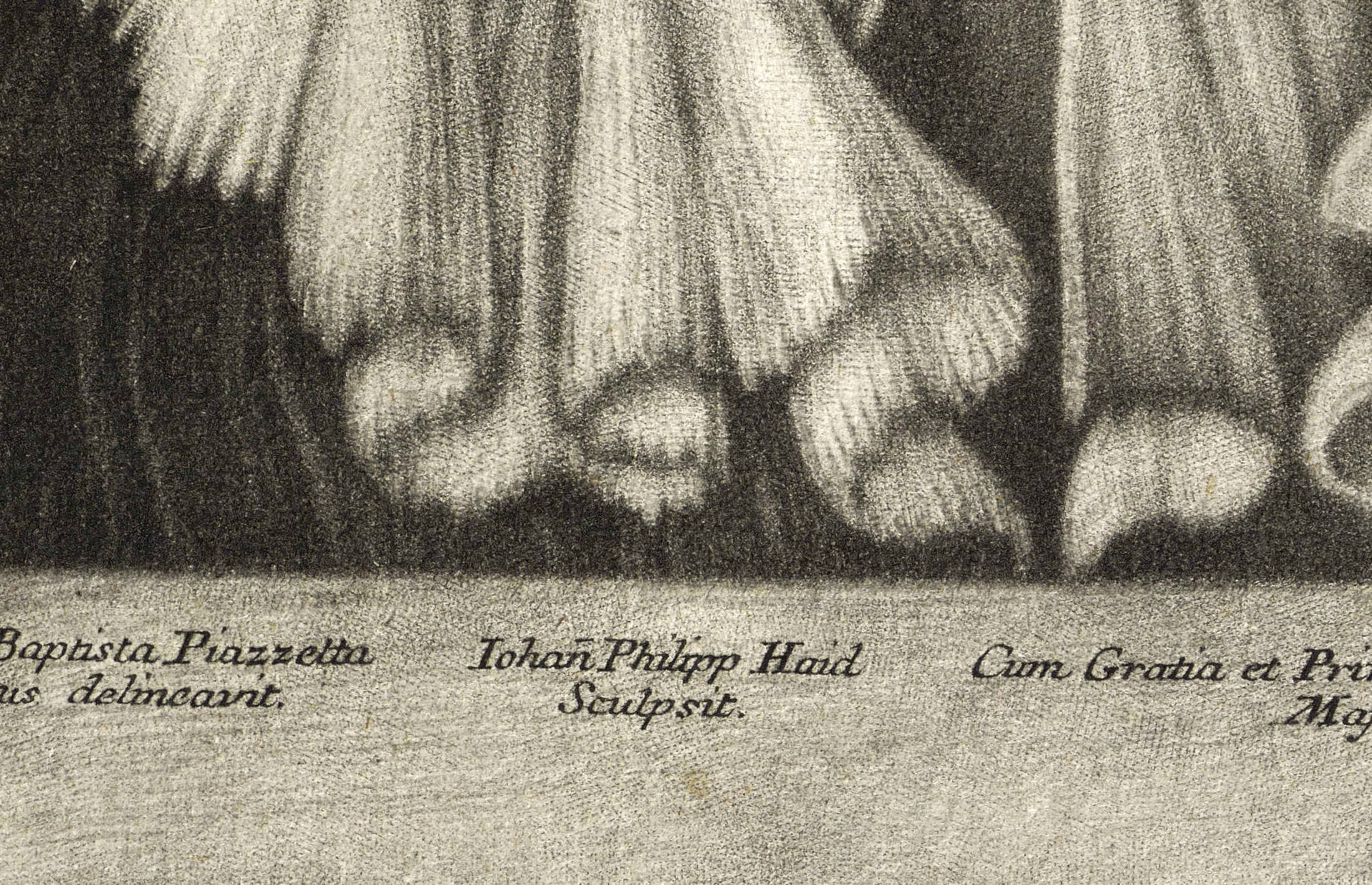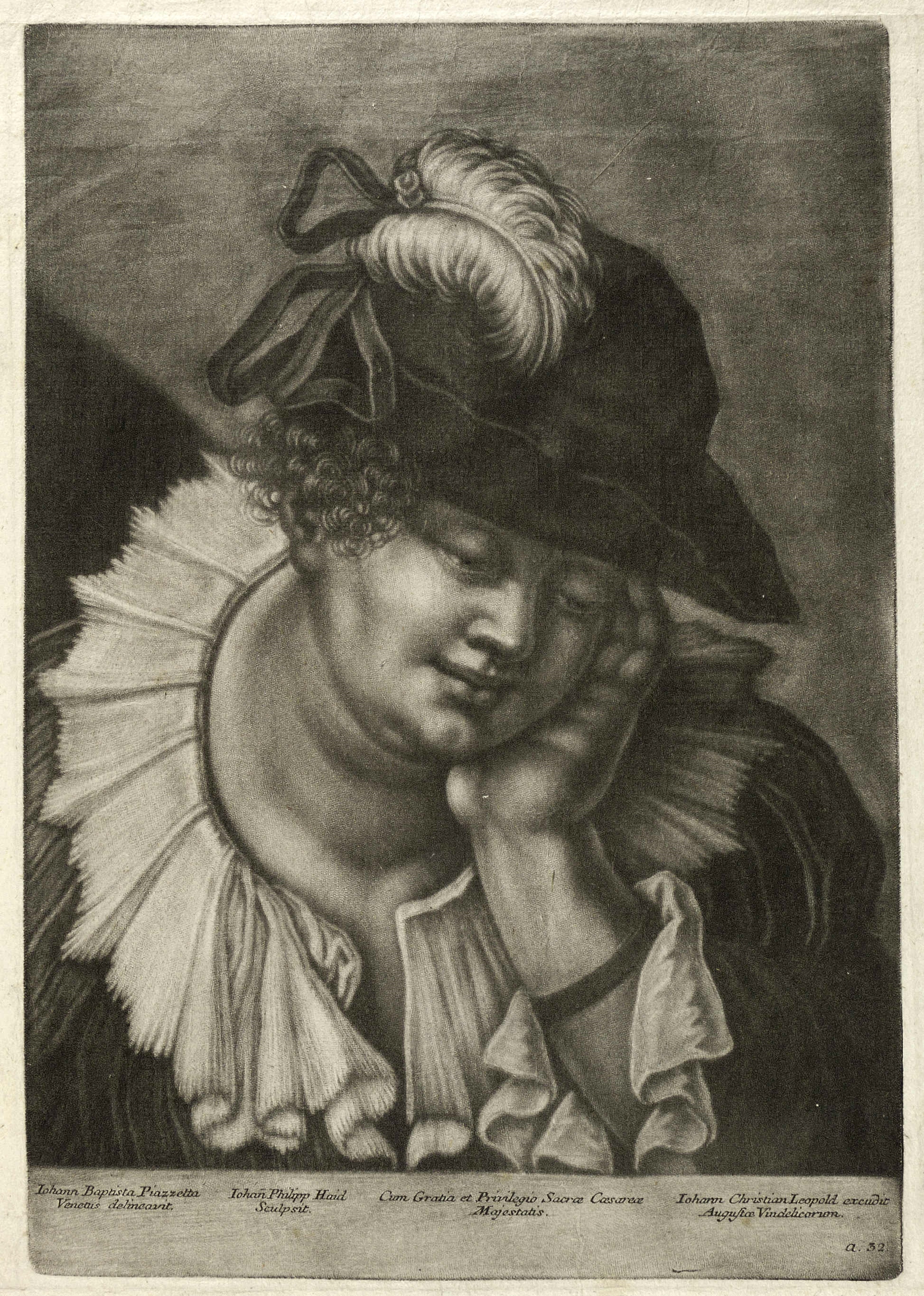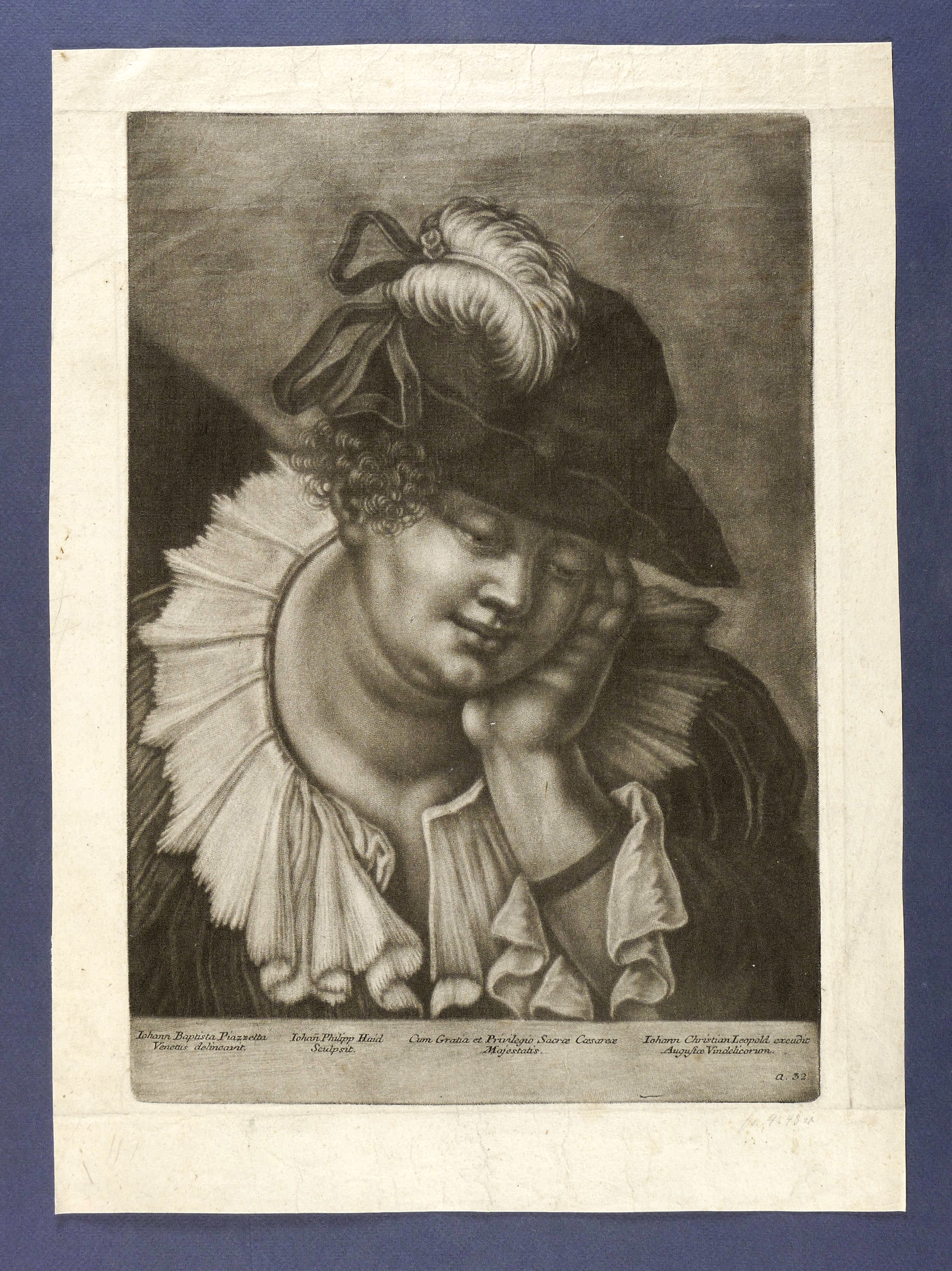 In der Platte unterhalb der Darstellung geschnittene Bezeichnung und Signatur: ″Iohann Baptista Piazzetta Venetiis delineavit. // Iohan(n) Philipp Haid Sculpsit // ...″ Dazu Verlegeradresse von Johann Christian Leopold in Augsburg. – Breiter Rand um die Platte. Durchgehend etwas angeschmutzt und knickspurig. Insgesamt noch guter Zustand.