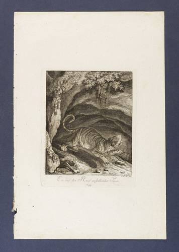Thienemann 425. – Aus: Johann Elias Ridinger, Entwurff einiger Thiere, wie solche nach ihren unterschiedenen Arten, Actionen und Leidenschafften, nach dem Leben gezeichnet (Augsburg: Johann Elias Ridinger 1738-1754), Bd. 1-7. – In der Platte rechts unten signiert: ″J.E.R. fec.″ Dazu Titel sowie Platten- Nr.: ″N. 35.″ – Bei Thienemann wie folgt beschrieben: ″Dies ist nun erst der wahre Tiger (Felis tigris. Linn.). Er springt wütend aus einer Höhle mit weit aufgesperrtem Rachen hervor.″ – Im linken Rand Bindungsspuren. Sehr guter Zustand.