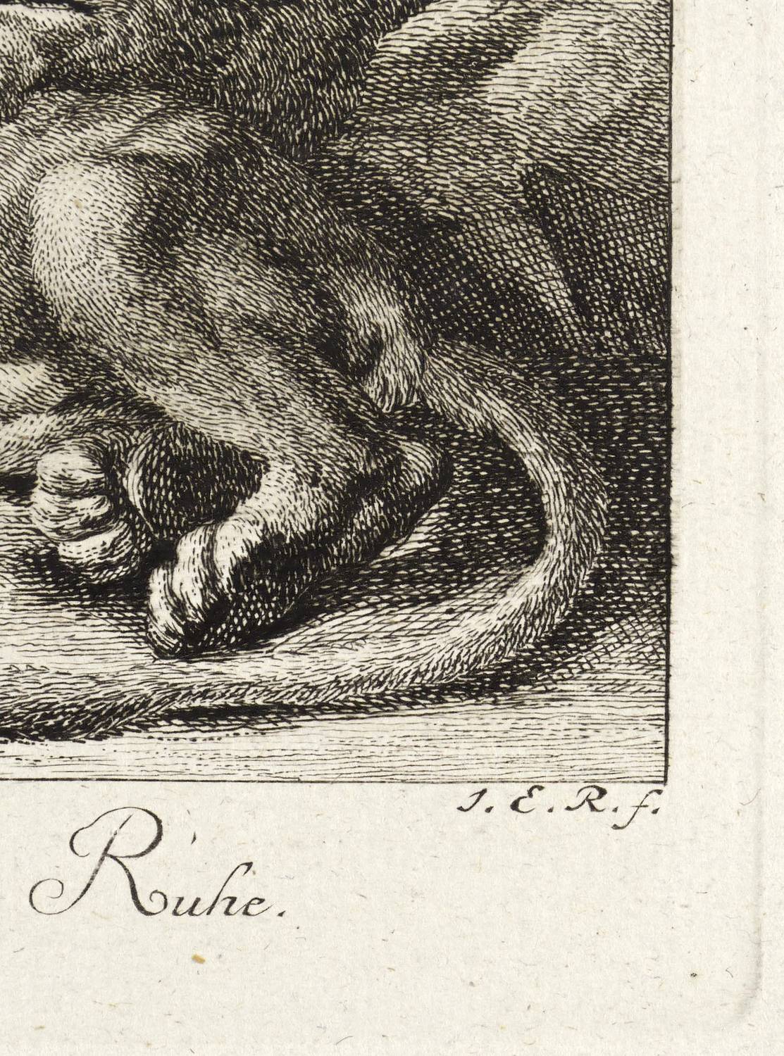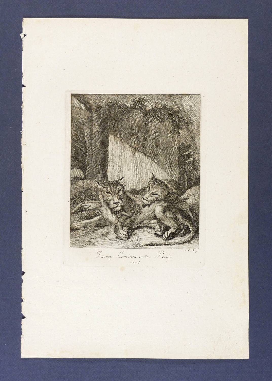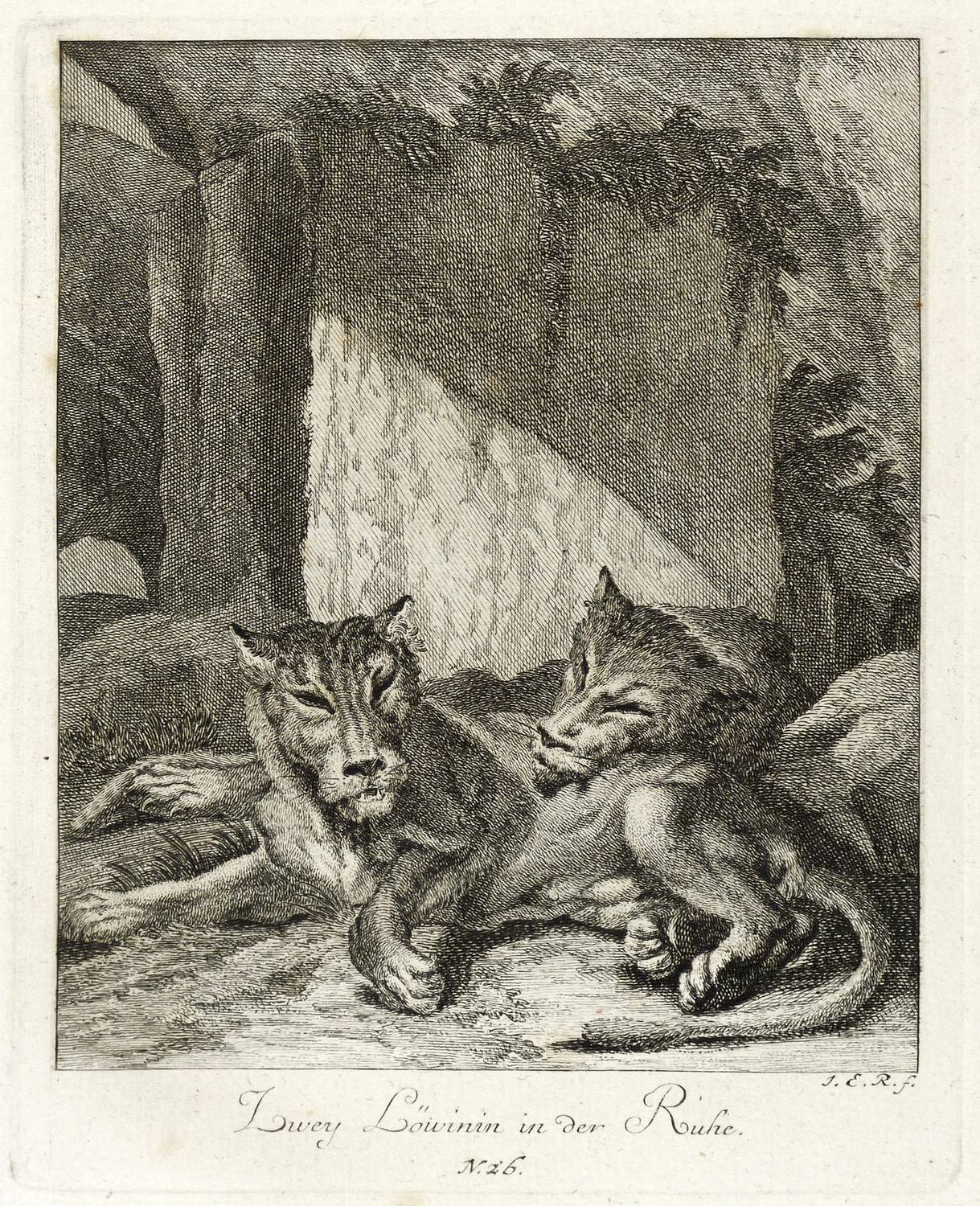 Thienemann 416. – Aus: Johann Elias Ridinger, Entwurff einiger Thiere, wie solche nach ihren unterschiedenen Arten, Actionen und Leidenschafften, nach dem Leben gezeichnet (Augsburg: Johann Elias Ridinger 1738-1754), Bd. 1-7. – In der Platte rechts unten signiert: ″J.E.R. fec.″ Dazu Titel sowie Platten- Nr.: ″N. 26.″ – Bei Thienemann wie folgt beschrieben: ″Sie schlafen traulich nebeneinander liegend.″ – Im linken Rand Bindungsspuren. Durchgehend leicht fleckig. Noch guter Zustand.