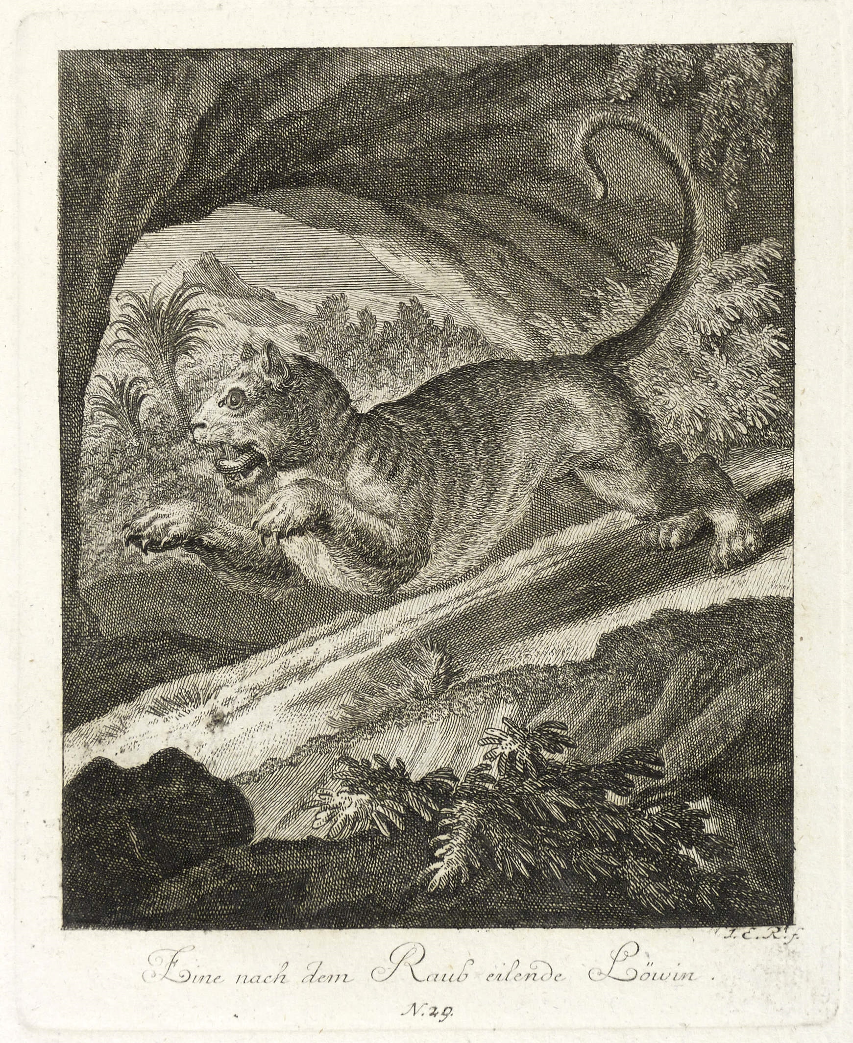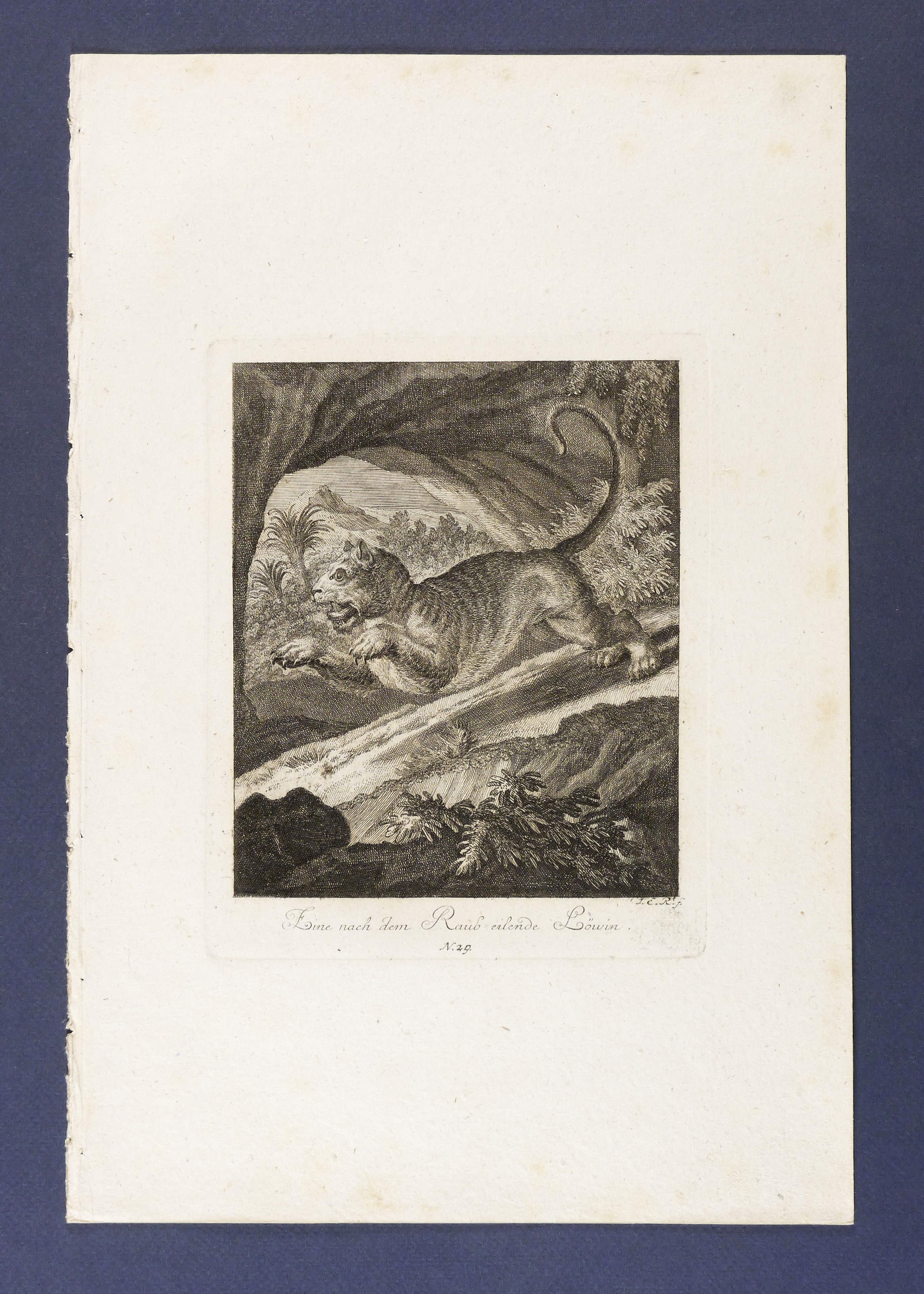Raubkatzen. – Löwen. - Jagendes Weibchen. – Ridinger. – „Eine nach dem Raub eilende Löwin”.