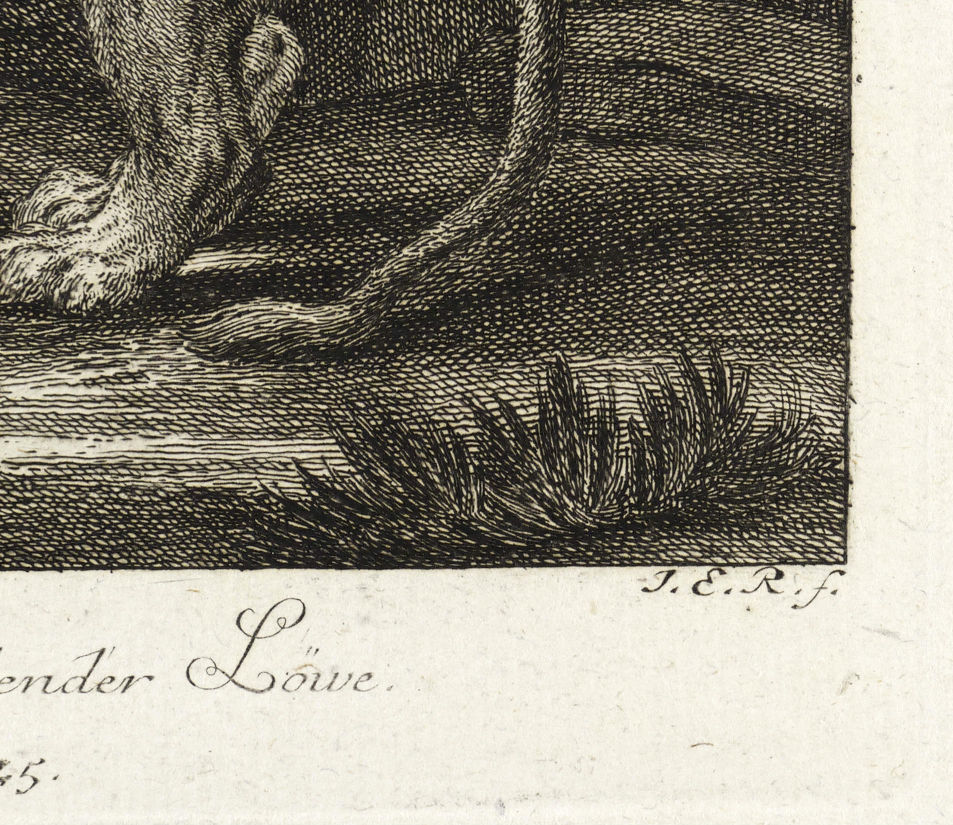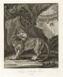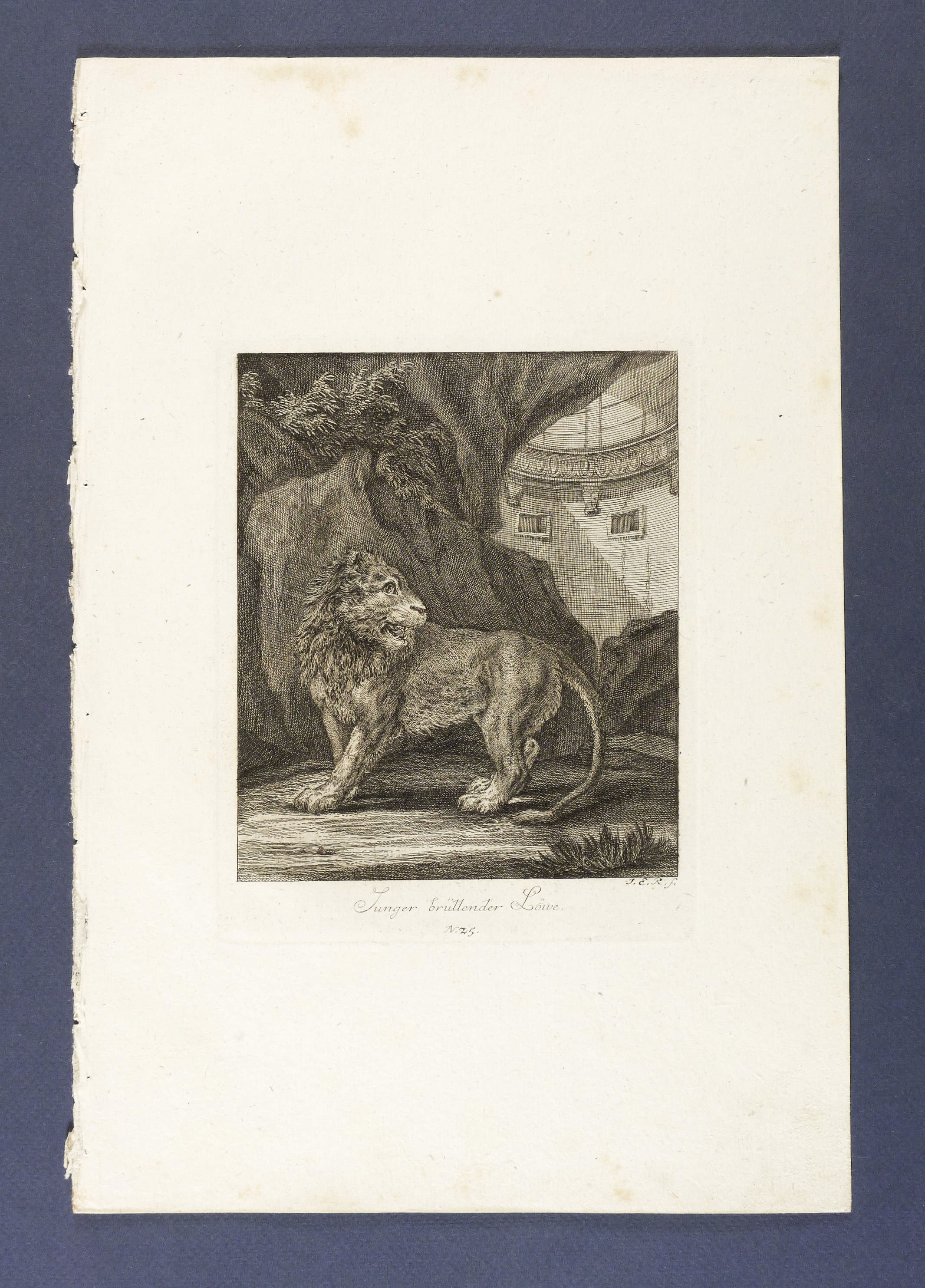 Thienemann 415. – Aus: Johann Elias Ridinger, Entwurff einiger Thiere, wie solche nach ihren unterschiedenen Arten, Actionen und Leidenschafften, nach dem Leben gezeichnet (Augsburg: Johann Elias Ridinger 1738-1754), Bd. 1-7. – In der Platte rechts unten signiert: ″J.E.R. f.″ Dazu Titel sowie Platten-Nr.: ″N. 25.″ – Bei Thienemann wie folgt beschrieben: ″In einer Felsenhöhle sehen wir ihn mit noch kurzer Mähne und zurückgelegtem Kopfe.″ – Im linken Rand Bindungsspuren. Im Rand etwas fleckig. Noch guter Zustand.