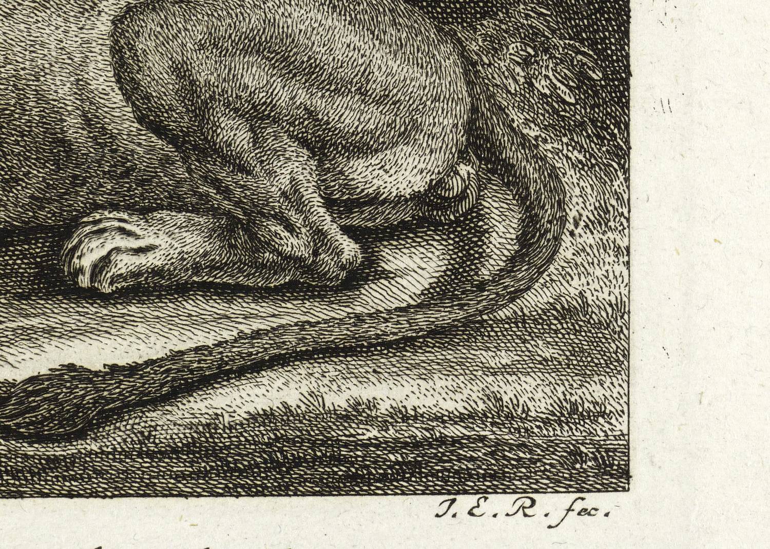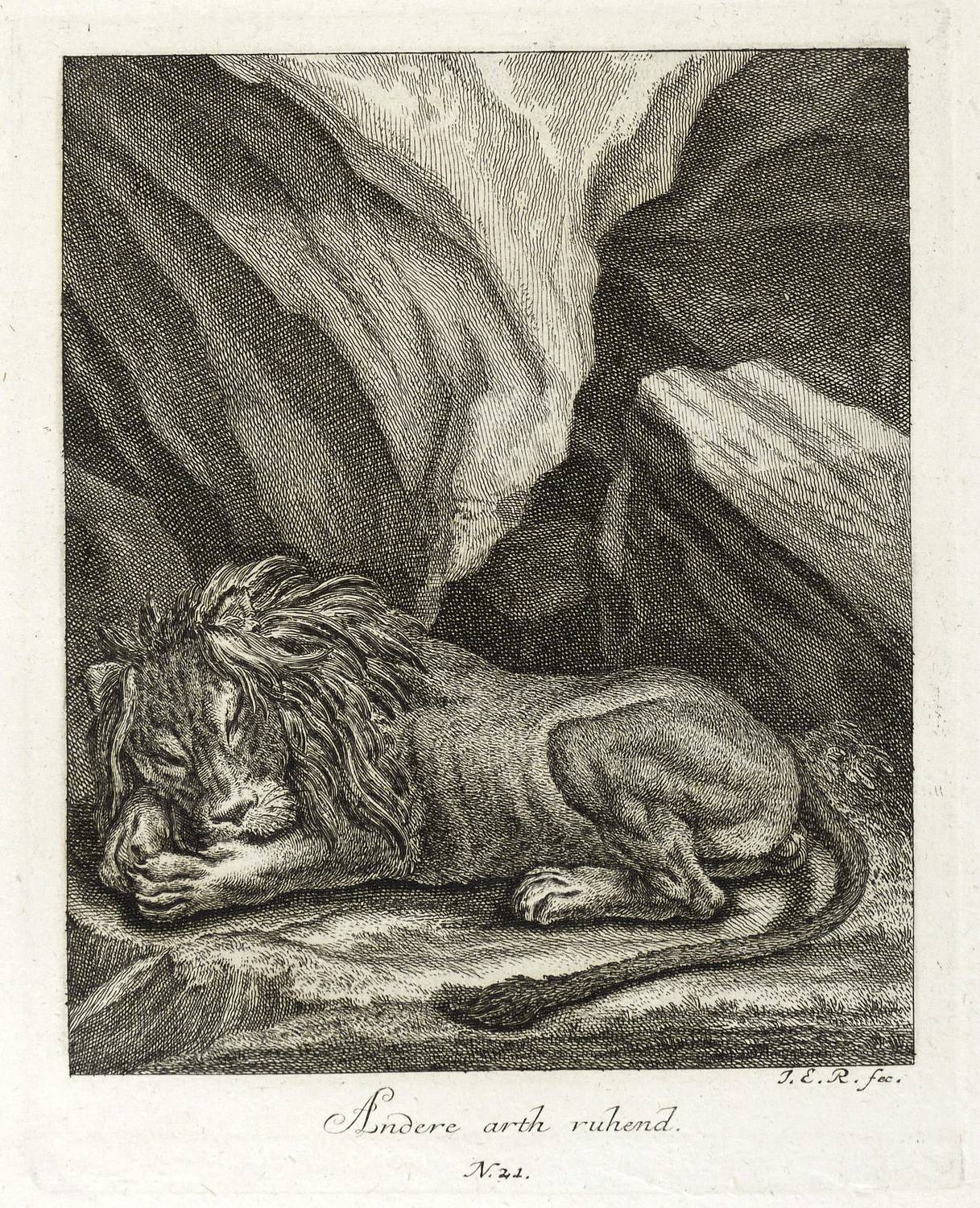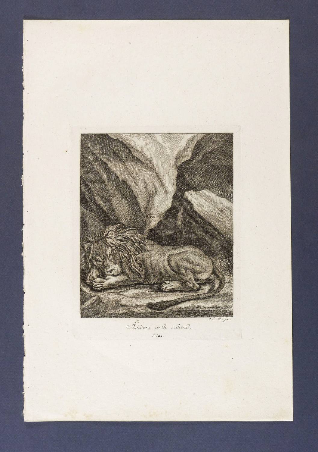 Thienemann 411. – Aus: Johann Elias Ridinger, Entwurff einiger Thiere, wie solche nach ihren unterschiedenen Arten, Actionen und Leidenschafften, nach dem Leben gezeichnet (Augsburg: Johann Elias Ridinger 1738-1754), Bd. 1-7. – In der Platte rechts unten signiert: ″J.E.R. fec.″ Dazu Titel sowie Platten- Nr.: ″N. 21.″ – Bei Thienemann wie folgt beschrieben: ″Er hat den Kopf zwischen die Vordertatzen gelegt. Schlaft fest und ruhig.″ – Im linken Rand Bindungsspuren. Sehr guter Zustand.
