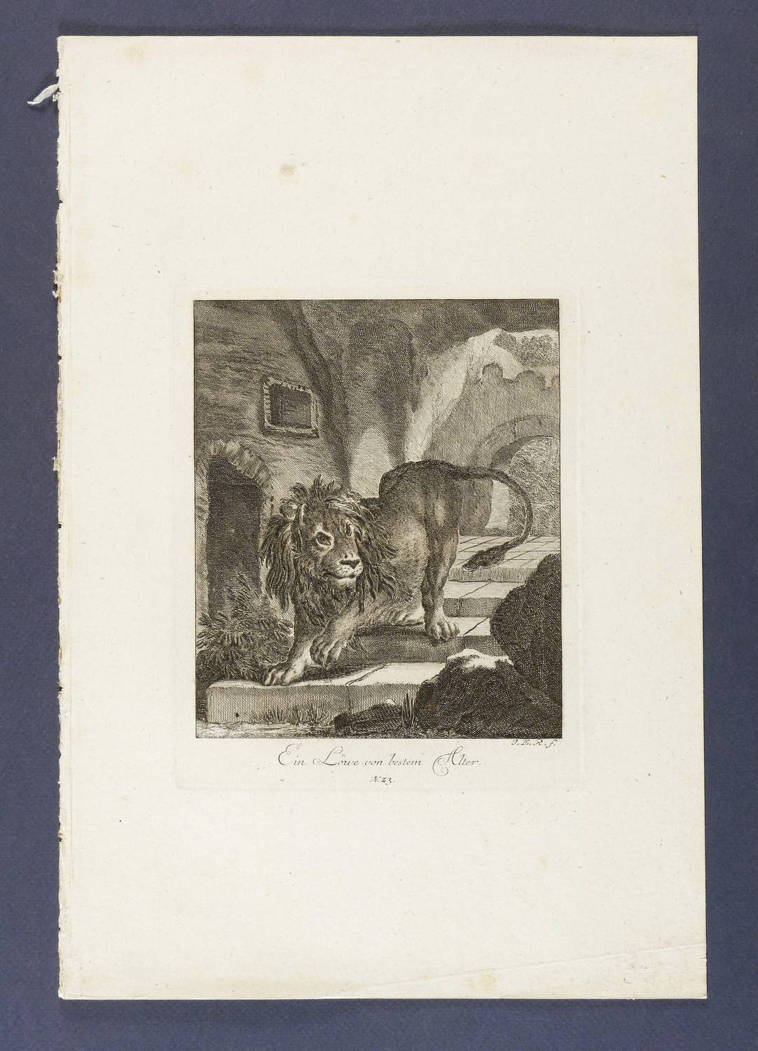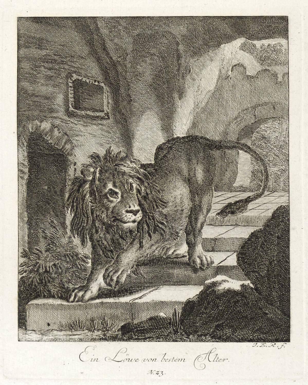 Thienemann 413. – Aus: Johann Elias Ridinger, Entwurff einiger Thiere, wie solche nach ihren unterschiedenen Arten, Actionen und Leidenschafften, nach dem Leben gezeichnet (Augsburg: Johann Elias Ridinger 1738-1754), Bd. 1-7. – In der Platte rechts unten signiert: ″J.E.R. f.″ Dazu Titel sowie Platten-Nr.: ″N. 23.″ – Bei Thienemann wie folgt beschrieben: ″In einer ausgemauerten Höhle steigt er steinerne Stufen herab.″ – Im linken Rand Bindungsspuren. Partiell geringfügig fleckig. Noch guter Zustand.