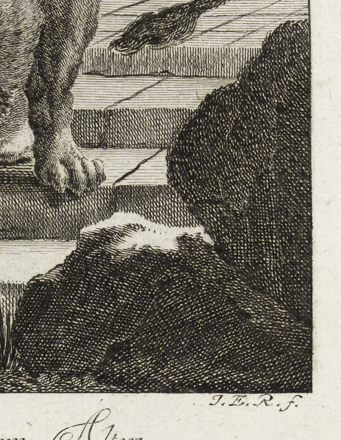 1738. Radierung / Strichätzung, in Schwarz, auf grobem Büttenpapier. – Historische Buchillustration, von Johann Elias Ridinger. – 16,2 x 13,5 cm (Darstellung), 18,5 x 15,0 cm (Platte), 36 x 24 cm (Blatt).