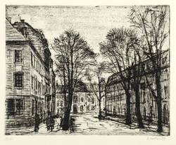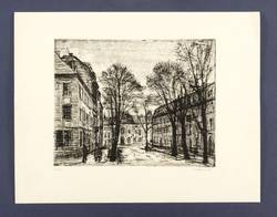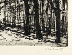 1989. Radierung / Strichätzung, in Schwarz, auf gelblichem Karton. – Originale Künstlergrafik, von Bernhard Koban. – Probedruck. – 19,5 x 24,5 cm (Darstellung / Platte), 29,5 x 37,5 cm (Blatt).