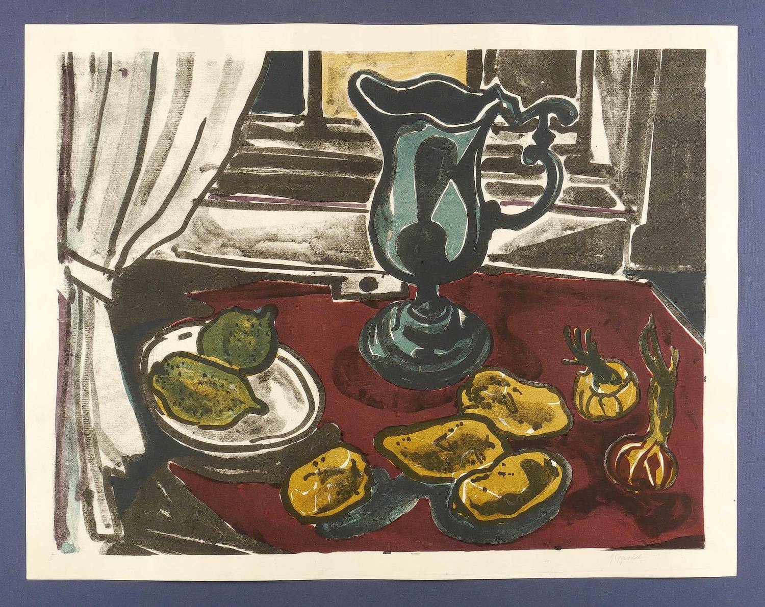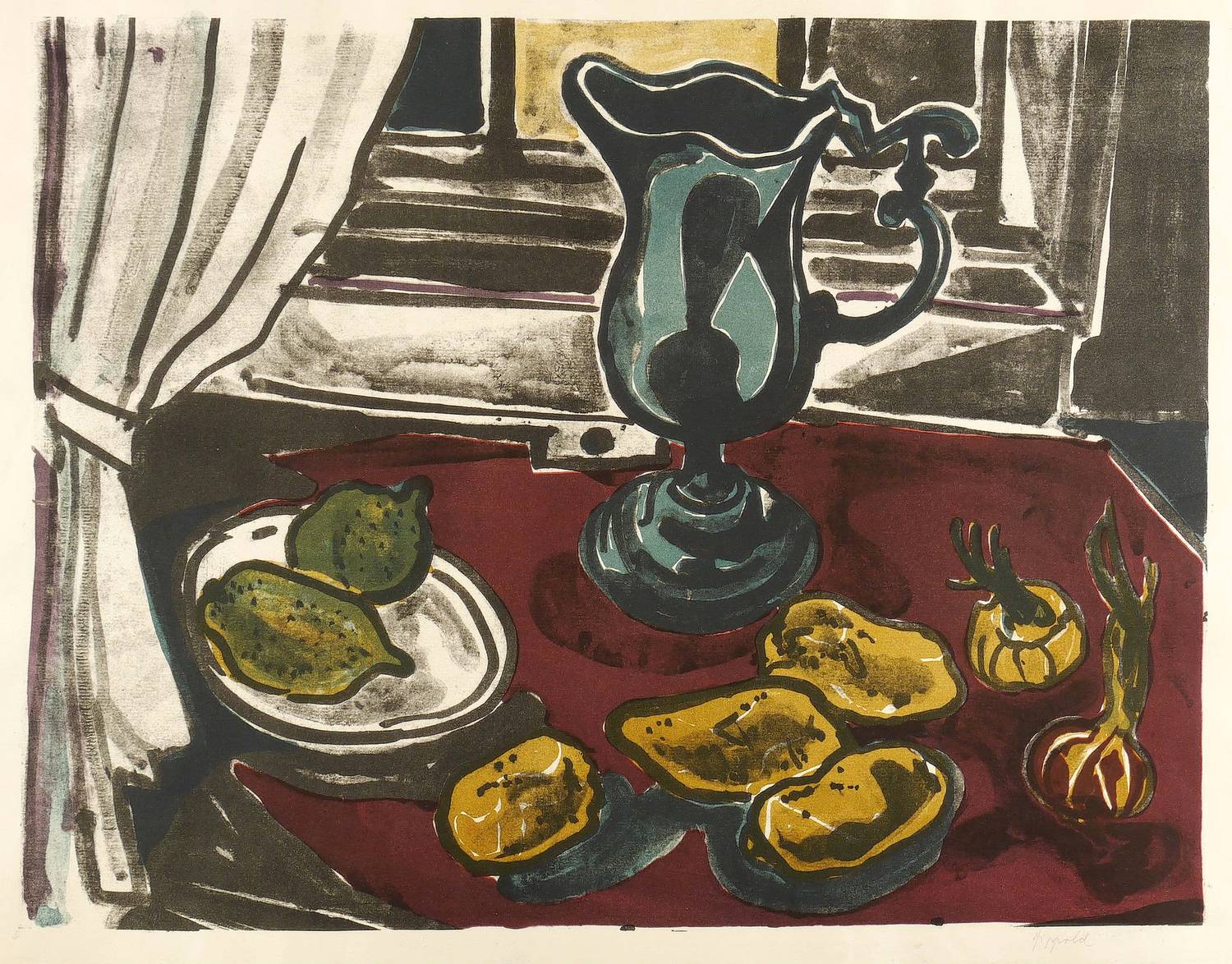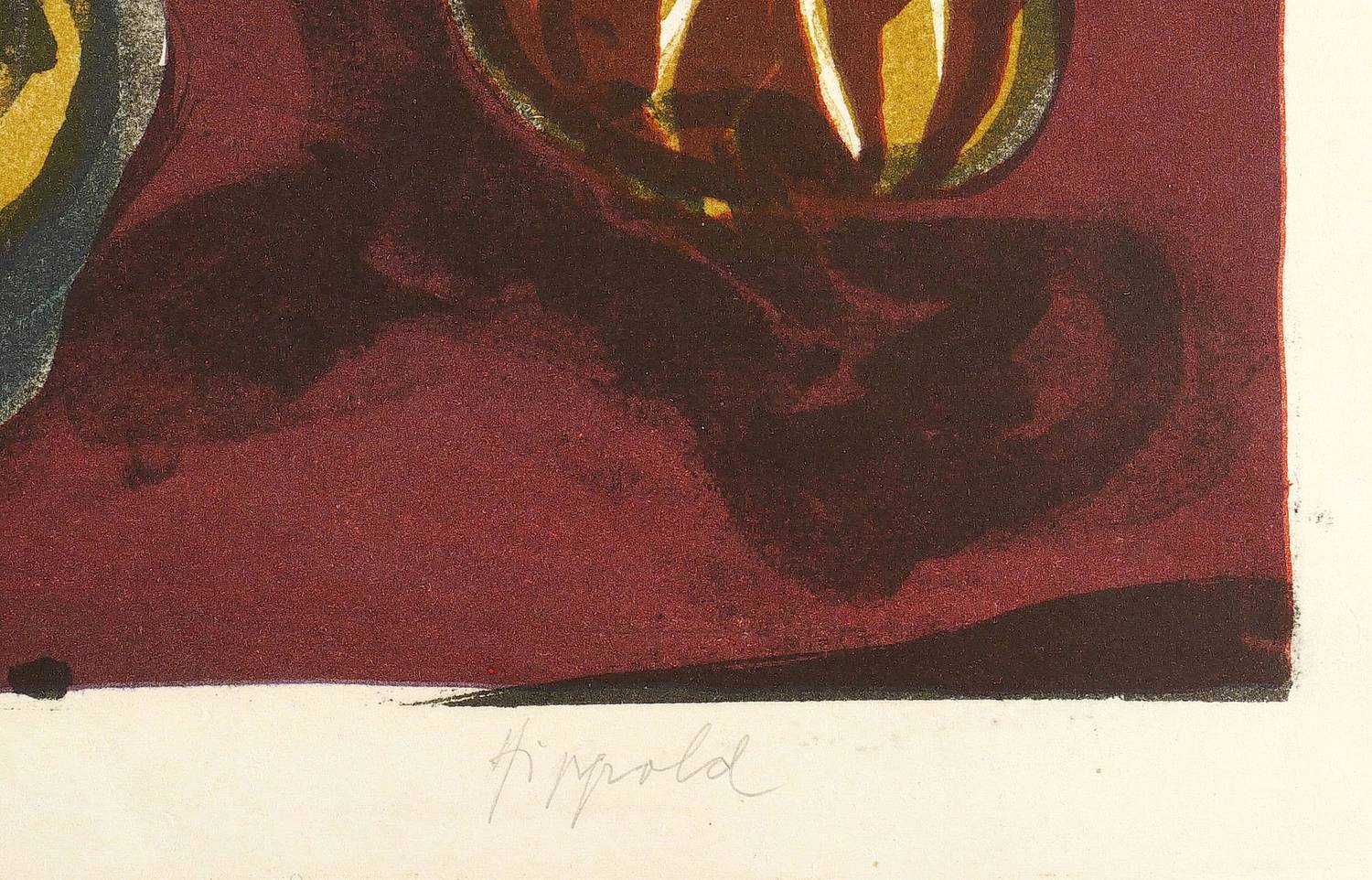 1950-1960. Farblithografie / Pinsellithografie, in 6 Farben, auf hellgelbem Büttenpapier. – Originale Künstlergrafik, von Erhard Hippold. – 44,5 x 57,4 cm (Darstellung / Druckbild), 49 x 64 cm (Blatt).