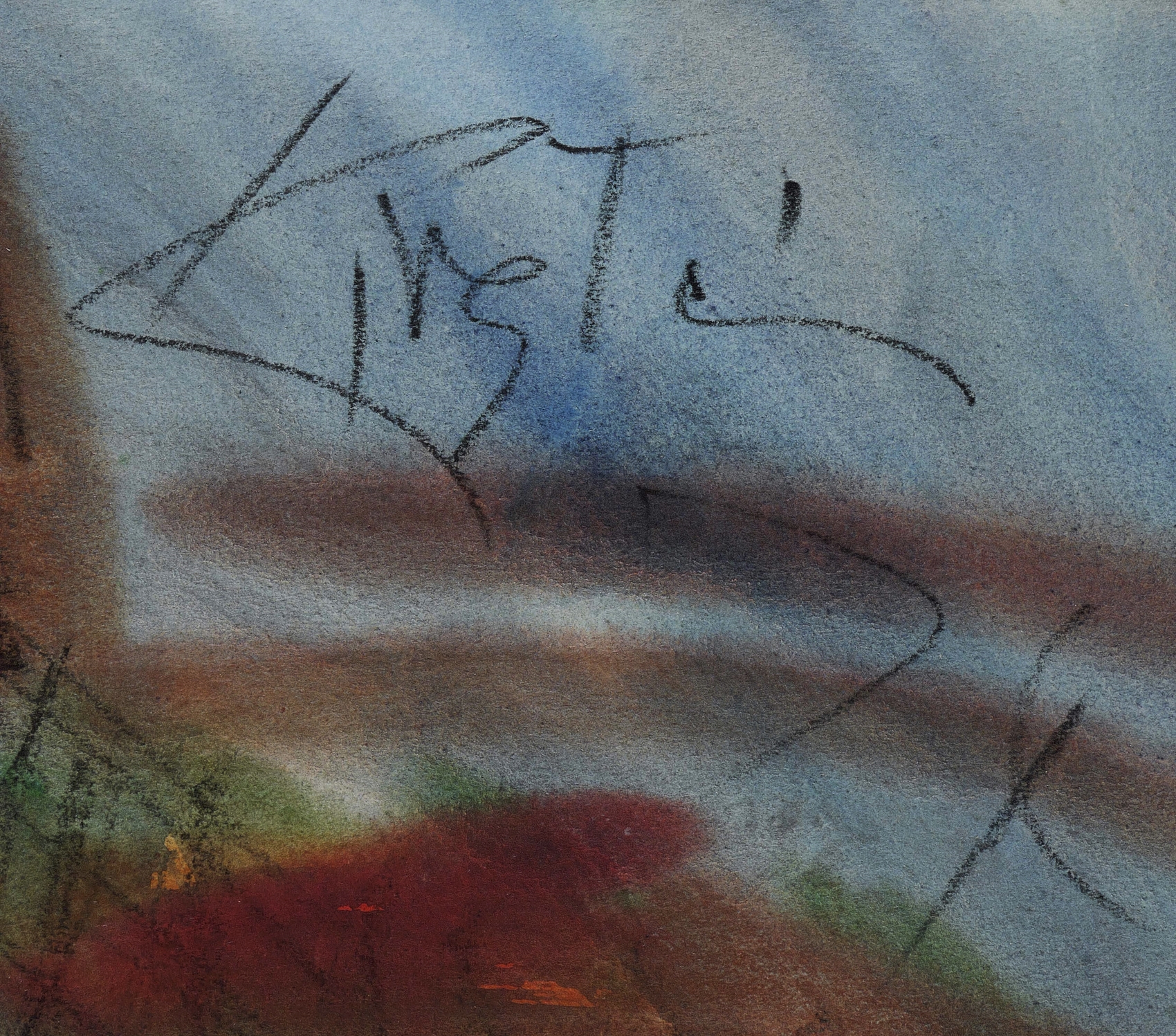 1974. Aquarell, über schwarzer Kreide, auf hellem Karton. – Originale Künstlergrafik, von Helmut Schmidt-Kirstein. – Unikat. – 36,7 x 51,2 cm (Darstellung / Blatt).
