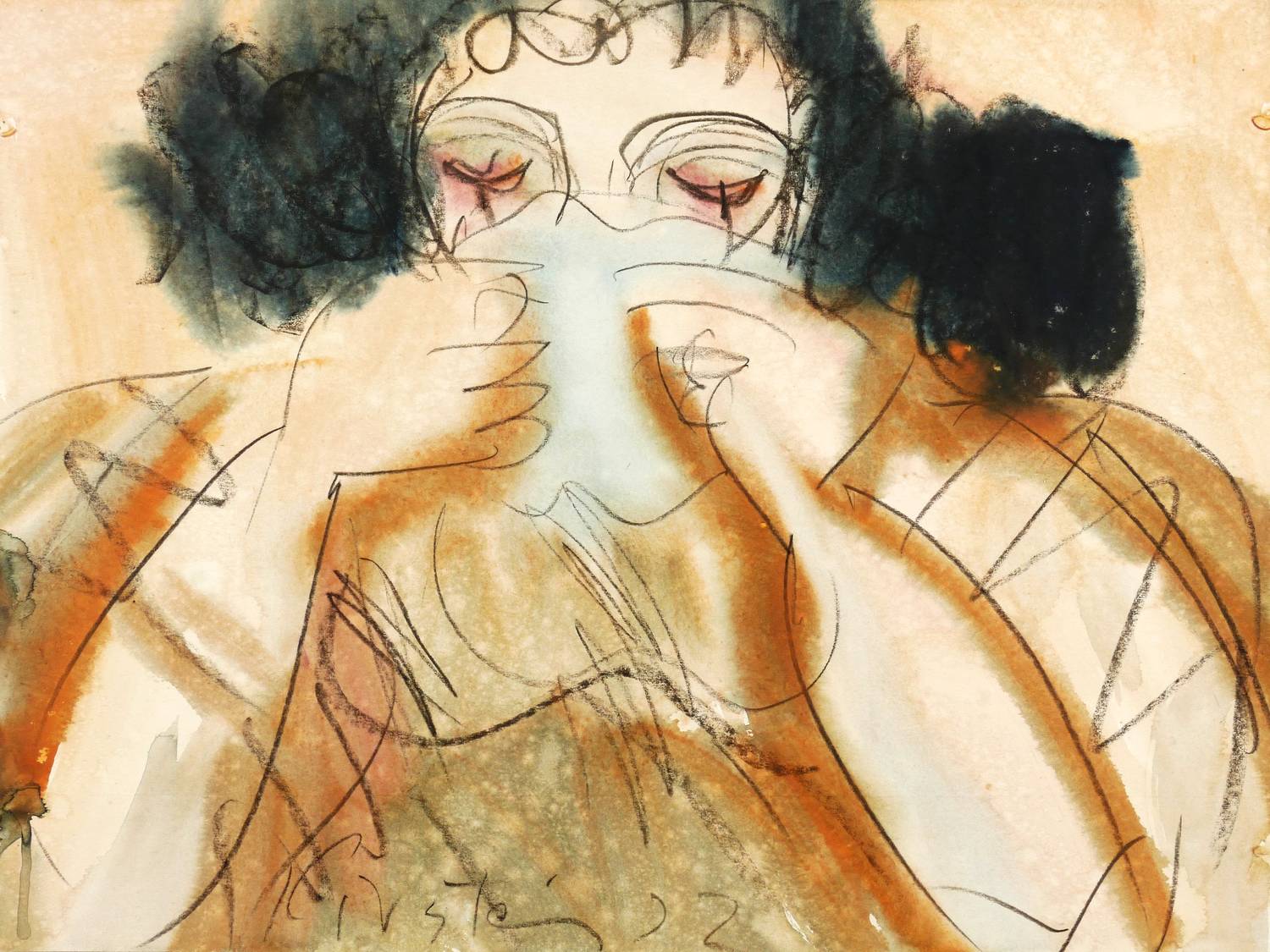In der Darstellung links unten mit Kreide signiert und datiert: ″Kirstein 72″. Verso in Bleistift von fremder Hand bezeichnet: ″Die weinende Frau″. Dazu Künstlername und Ausstellungs-Nr. – In den Ecken originale Reißzwecklöchlein. Wasserfarben frisch leuchtend. Verso leichte MOntagespuren. Sehr guter Zustand.