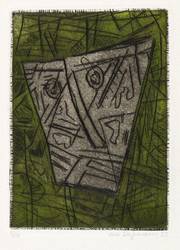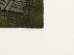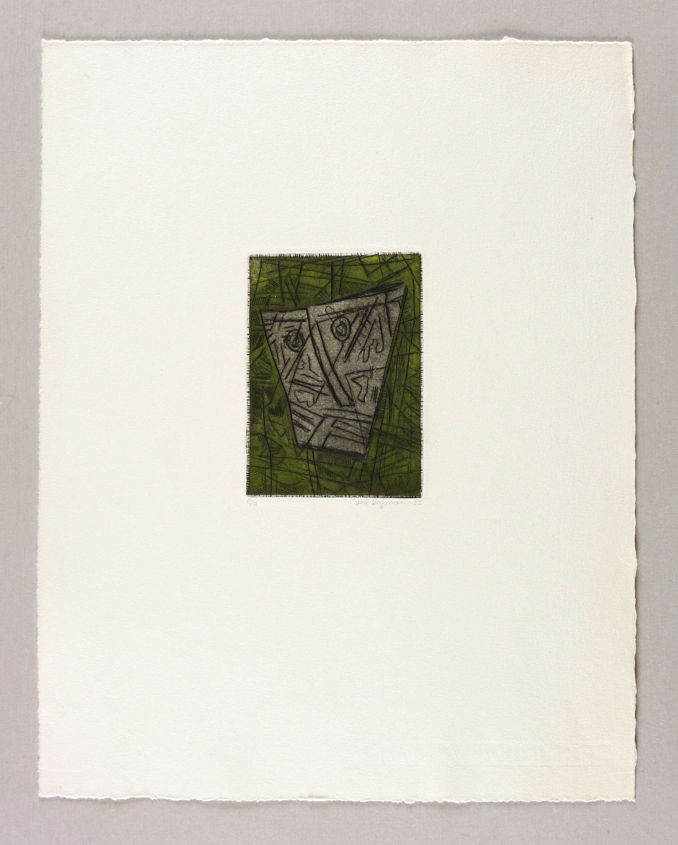 1985. Farbradierung / Aquatinta & Strichätzung, in 3 Farben, auf hellchamois Velin. – Originale Künstlergrafik, von Veit Hofmann. – Künstlerexemplar (e.a.). – 10,9 x 7,9 cm (Darstellung / Platte), 34 x 27 cm (Blatt).