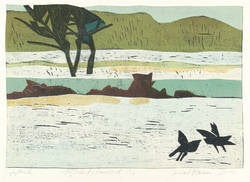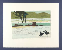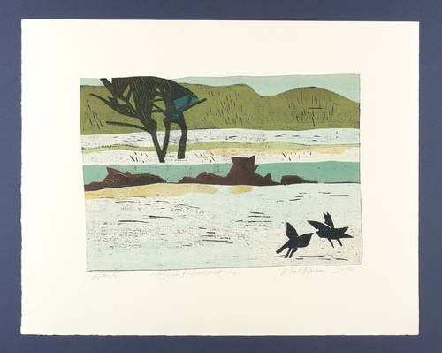 Unterhalb der Darstellung signiert und datiert rechts und links betitelt. Mittig Auflagenbezeichnung und bezeichnet ″Holzschnitt Handdruck″. Am Blattrand links unten Wasserzeichen der Hahnemühle. – Elbuferlandschaft mit Krähen. – Tadelloser Zustand.