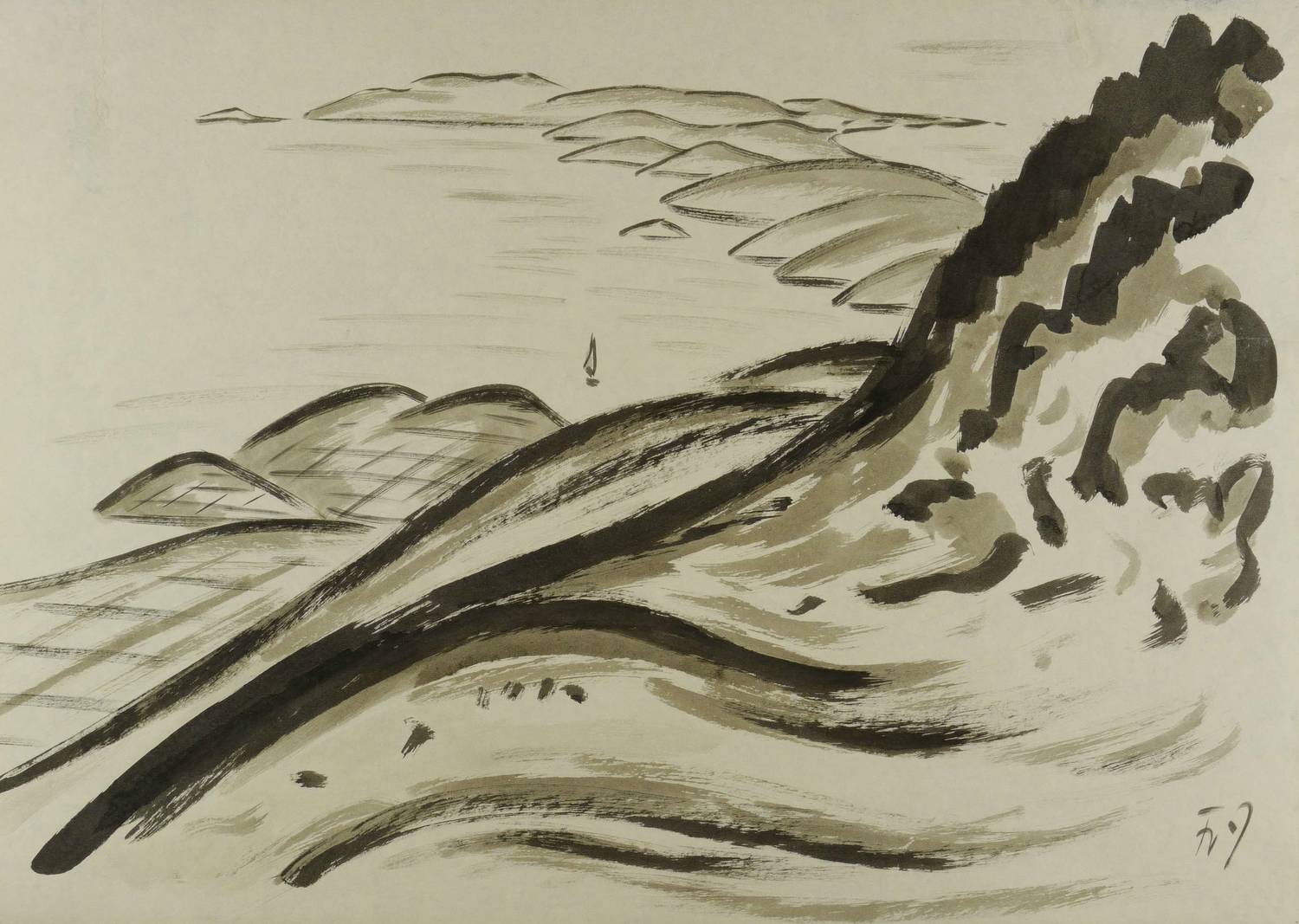 Um 1925. Zeichnung / Pinselzeichnung, in schwarzer Tusche, hellgrau laviert. – Von Fritz Zalisz. – 51,0 x 70,5 cm (Darstellung / Blatt).