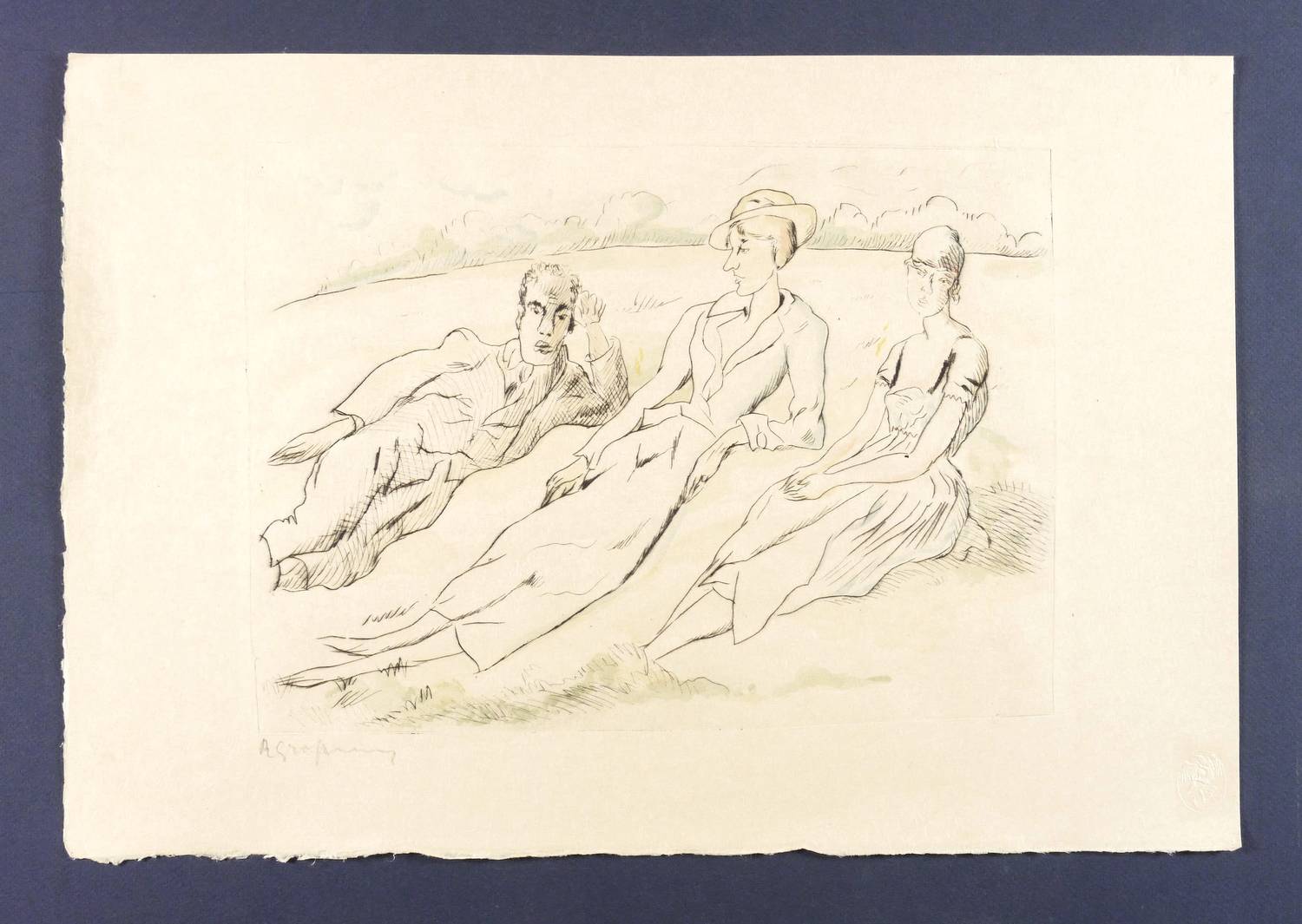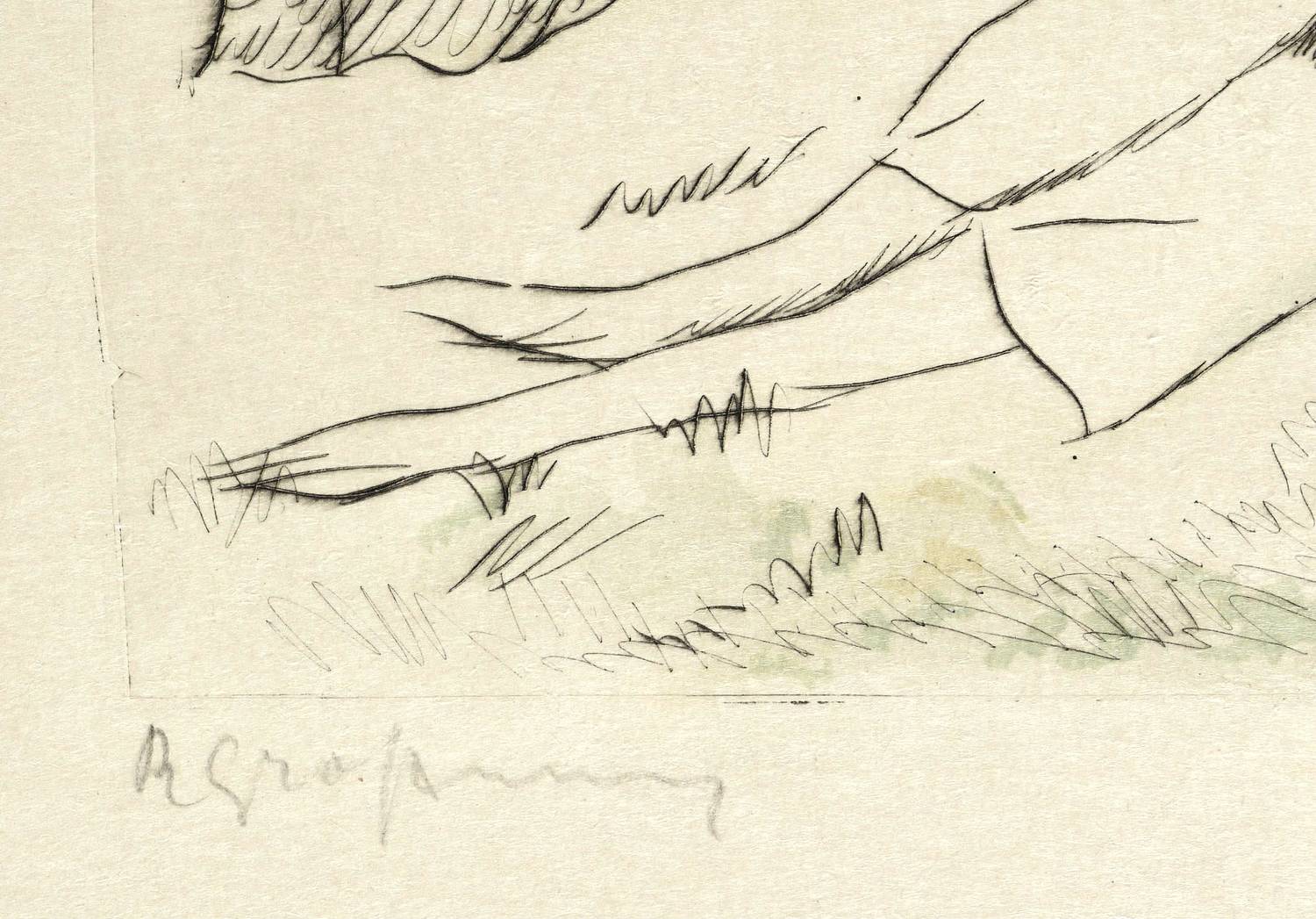 1925-1930. Radierung / Kaltnadel, aquarelliert, auf feinem gelblichem Japanbütten. – Originale Künstlergrafik, von Rudolf Großmann. – 23,8 x 32,9 cm (Darstellung / Platte), 33 x 48 cm (Blatt).