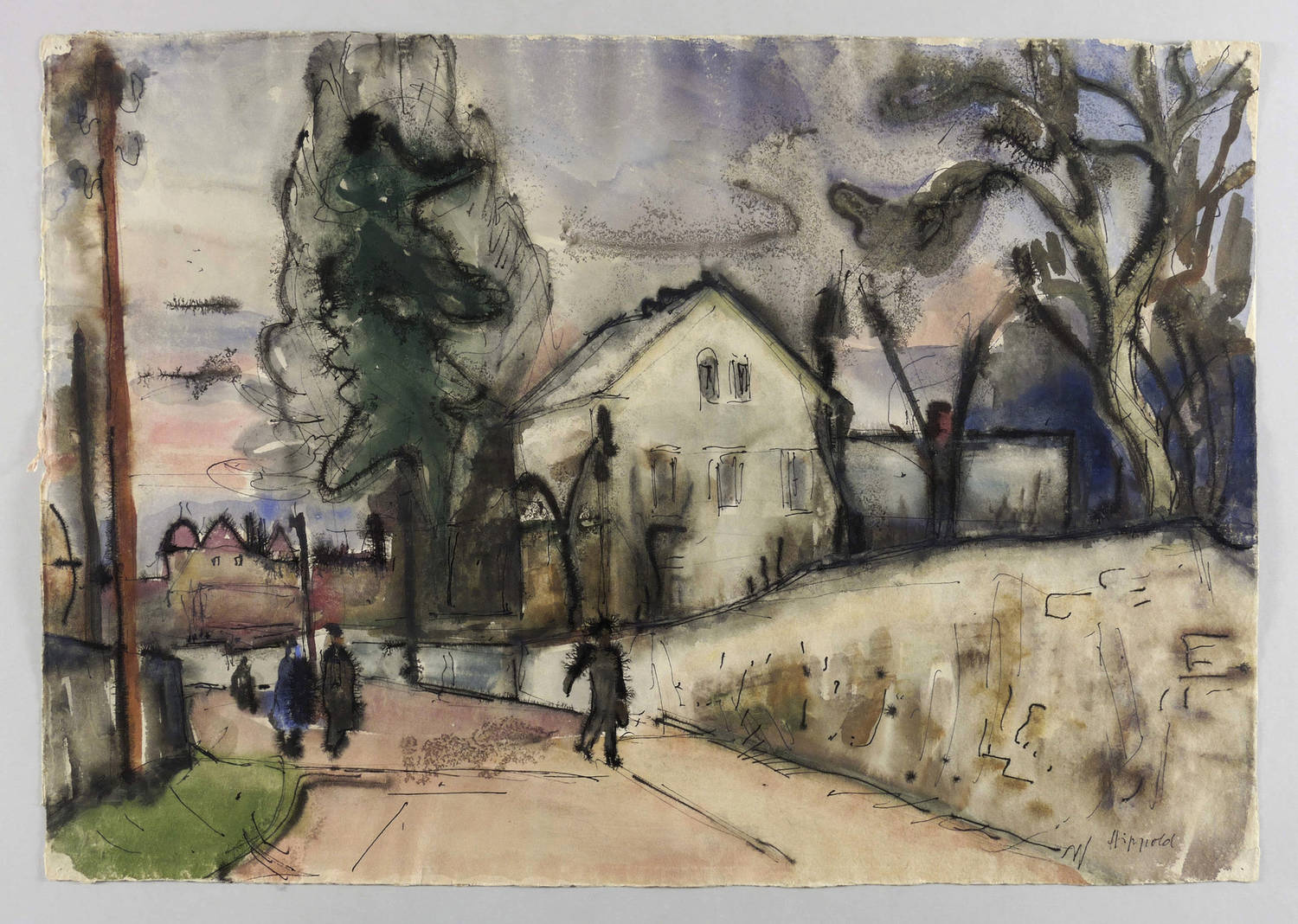 Rechts unten in schwarzer Tusche signiert: ″Hippold″. Verso in Bleistift Jahr, Titel und Signatur: ″(1940) / Strasse in Radebeul / Hippold″. Dazu diverse Ausstellungsnummern. – In den Ecken originale Reißzwecklöchlein. Rückseitig Montagespuren. Guter bis sehr guter Zustand.