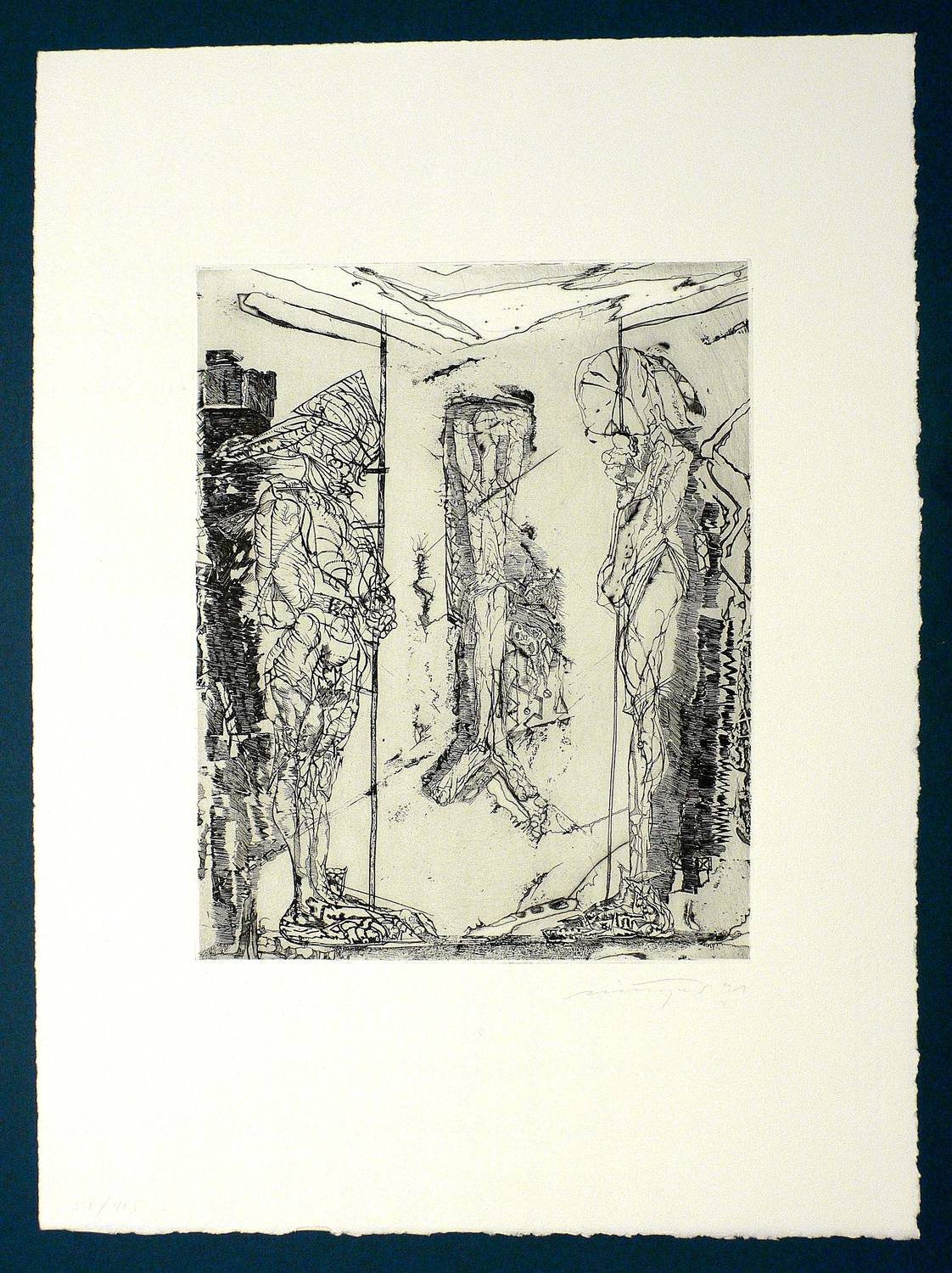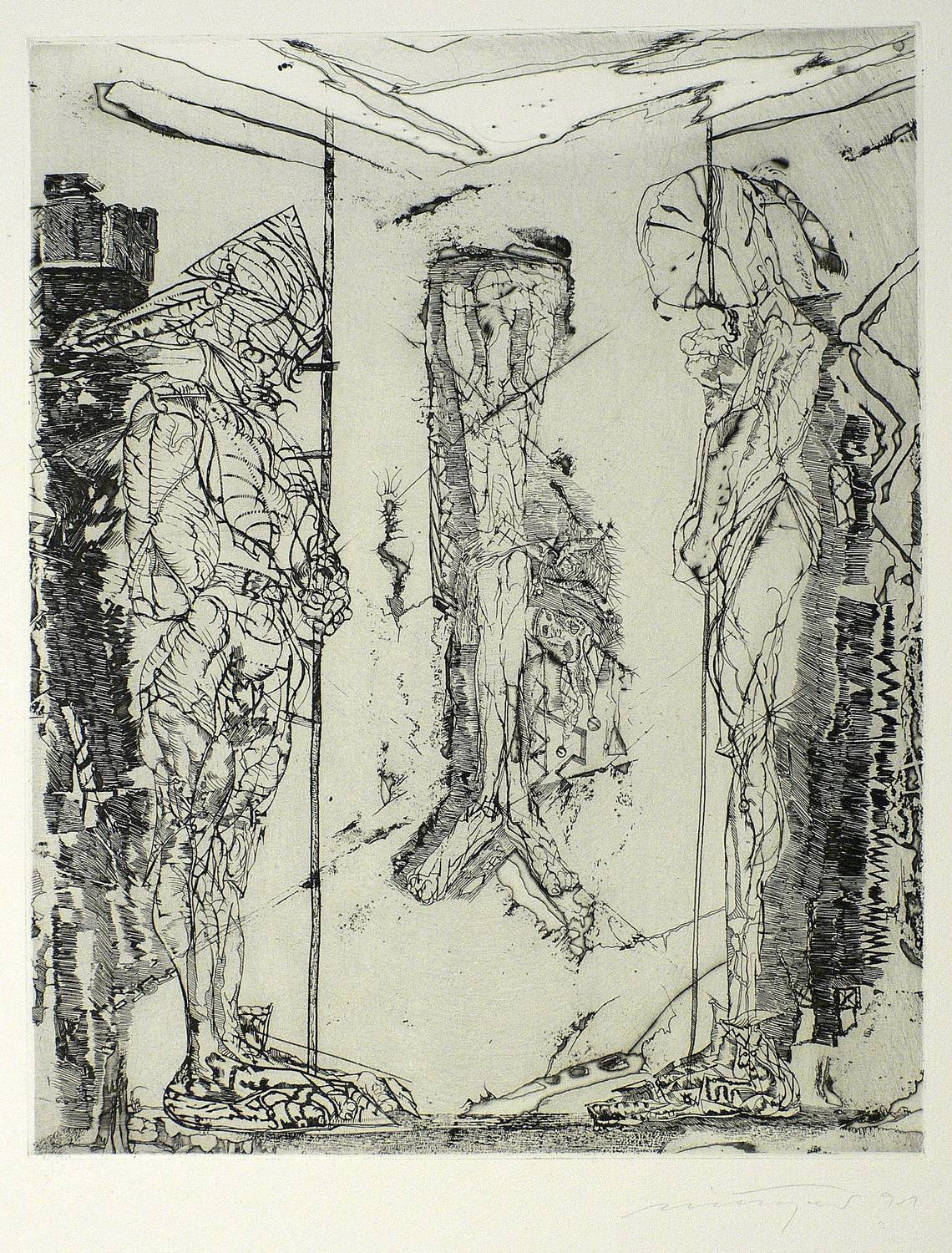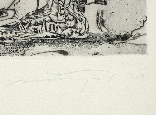 1991. Radierung / Strichätzung & Roulette, mit Plattenton, auf hellchamois Hahnemühle-Bütten. – Originale Künstlergrafik, von Rolf Münzner. – Auflage Exemplar Nr. 37/105. – 31,1 x 25 cm (Darstellung / Platte), 53,5 x 39 cm (Blatt).