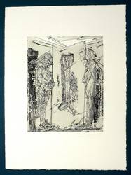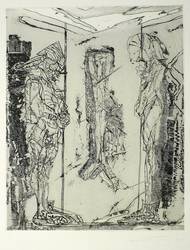 Rolf Münzner (1942 Geringswolde, lebt und arbeitet in Geithain bei Leipzig). Deutscher Zeichner und Grafiker. 1956-60 Lehre und Arbeit als Maschinenschlosser in Leisnig. 1960-62 besucht er Abendkurse an der Hochschule für Grafik und Buchkunst in Leipzig (HGB). 1962-67 Studium der Grafik und Illustration an der HGB u.a. bei Werner Tübke. 1969-72 Aspirantur. 1973-92 Lehrauftrag für Aktzeichnen und Illustration an der HGB. Seit 1990 Leiter der Werkstatt für Lithografie. Seit 1992 Professor. Seine skurrilen Figuren und bewegungsreichen Phantasiewelten werden in der seltenen Technik der Asphaltschabmanier im Steindruck umgesetzt. Detailreichtum und gesteigerte Virtuosität charakterisieren sein Werk ebenso wie eine Vorliebe für literarische Themen, denen er jeweils kongeniale Schöpfungen an die Seite stellt.