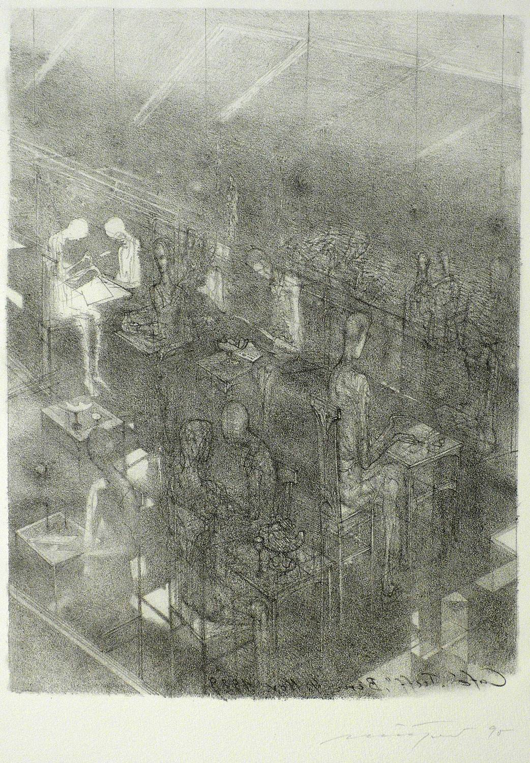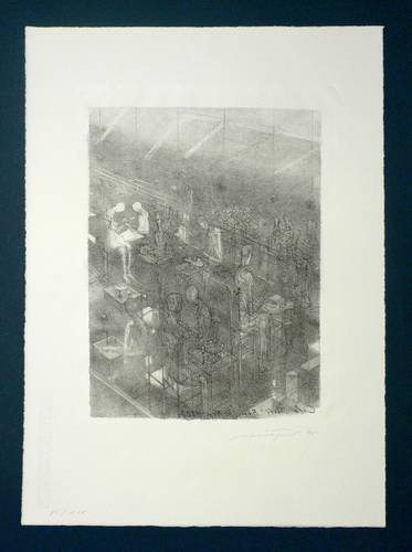 Rolf Münzner (1942 Geringswolde, lebt und arbeitet in Geithain bei Leipzig). Deutscher Zeichner und Grafiker. 1956-60 Lehre und Arbeit als Maschinenschlosser in Leisnig. 1960-62 besucht er Abendkurse an der Hochschule für Grafik und Buchkunst in Leipzig (HGB). 1962-67 Studium der Grafik und Illustration an der HGB u.a. bei Werner Tübke. 1969-72 Aspirantur. 1973-92 Lehrauftrag für Aktzeichnen und Illustration an der HGB. Seit 1990 Leiter der Werkstatt für Lithografie. Seit 1992 Professor. Seine skurrilen Figuren und bewegungsreichen Phantasiewelten werden in der seltenen Technik der Asphaltschabmanier im Steindruck umgesetzt. Detailreichtum und gesteigerte Virtuosität charakterisieren sein Werk ebenso wie eine Vorliebe für literarische Themen, denen er jeweils kongeniale Schöpfungen an die Seite stellt.