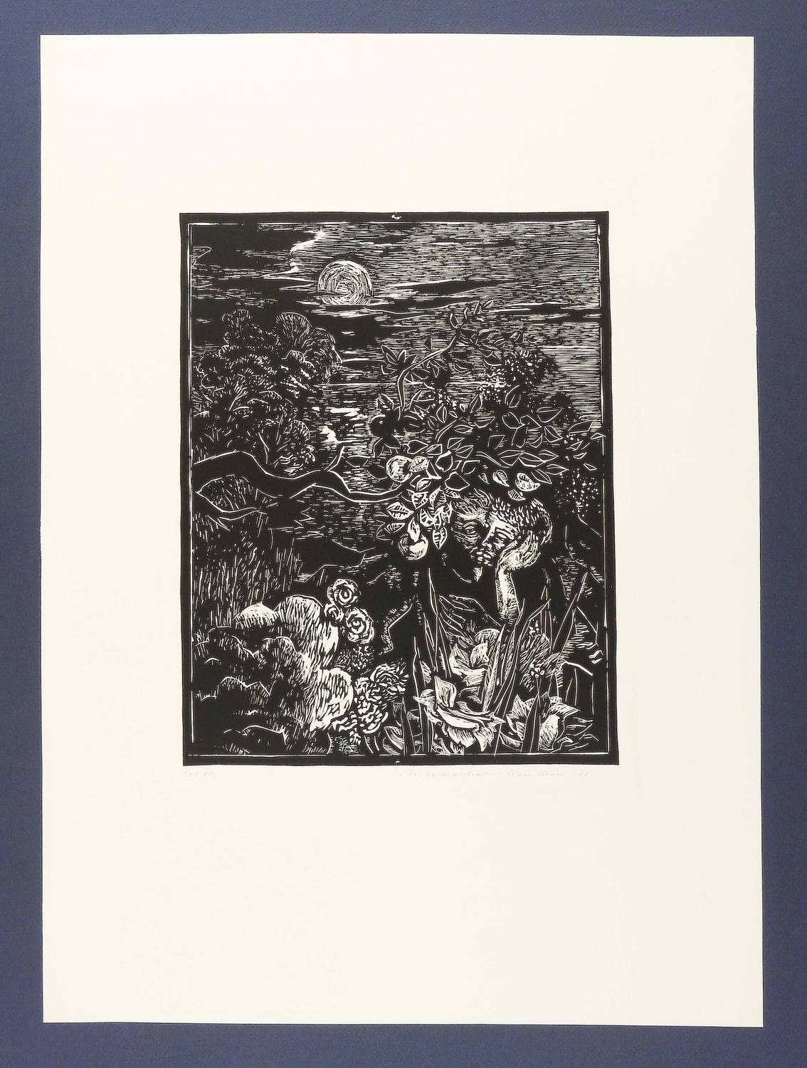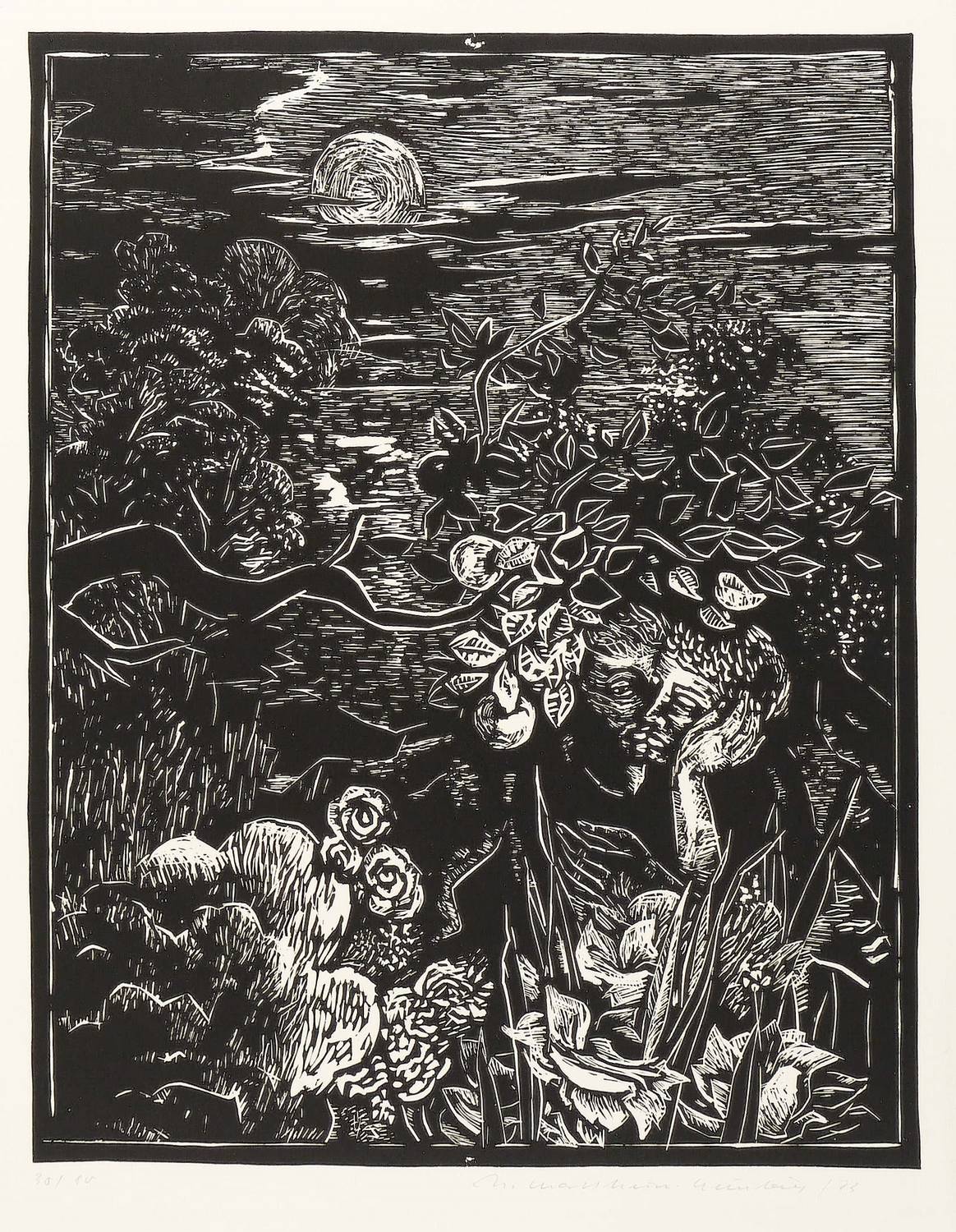 1973. Holzschnitt, in Schwarz, auf leichtem hellgelbem Papier. – Originale Künstlergrafik, von Ursula Mattheuer-Neustädt. – Auflage Exemplar Nr. 30/80. – 31,5 x 24,6 cm (Darstellung / Druckstock), 57 x 41 cm (Blatt).