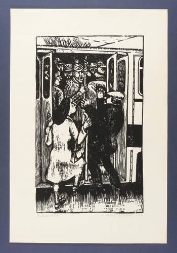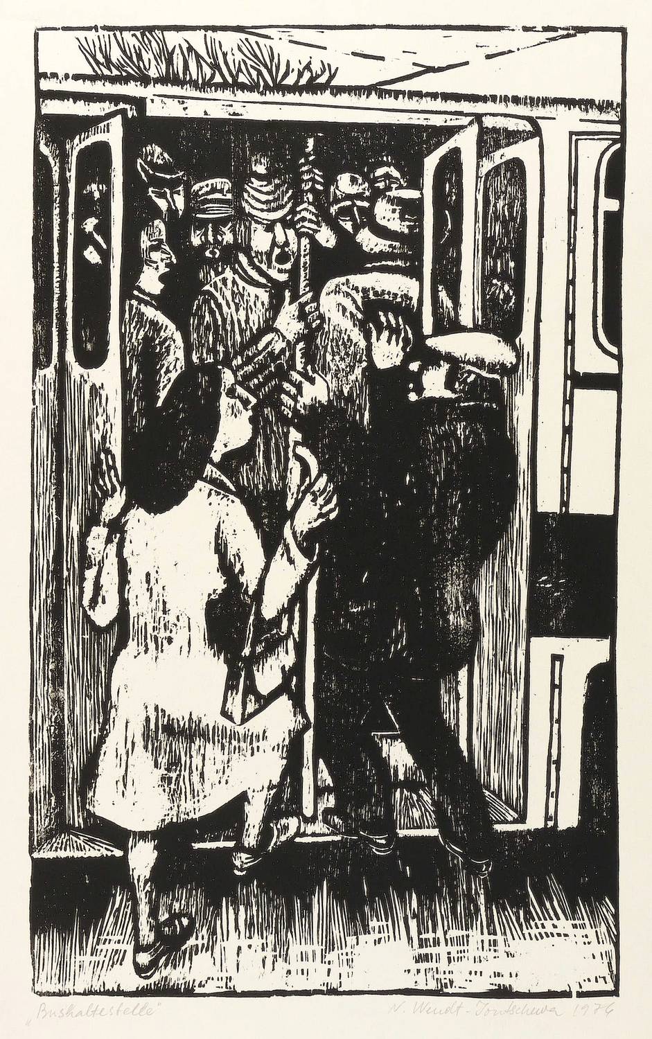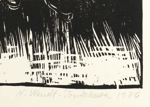 1974. Holzschnitt, in Schwarz, auf glattem hellgelbem Papier. – Originale Künstlergrafik, von Newena Wendt-Jontschewa. – 40,5 x 24,3 cm (Darstellung / Druckbild), 54 x 36 cm (Blatt).