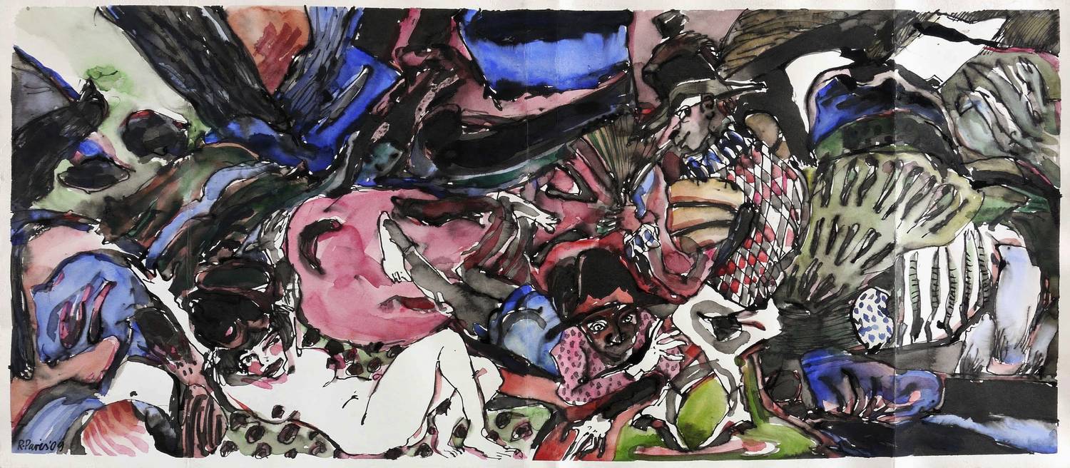 2009. Aquarell, mit schwarzer Tusche, auf weißem Karton. – Originale Künstlergrafik, von Ronald Paris. – Unikat. – 23,0 x 53,8 cm (Darstellung), 24,3 x 55,1 cm (Blatt).
