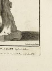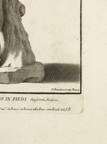 Aus: Paolo Alessandro Maffei, Raccolta di statue antiche e moderne (Rom: Stamperia alla Pace 1704). – In der Platte signiert: ″Cl. Randon Sculp. Romae″. Dazu betitelt: ″Un Amorino In Piedi – Negl´orti Medicei″. – Im unteren Rand ein Wasserfleck. Sonst guter Zustand.
