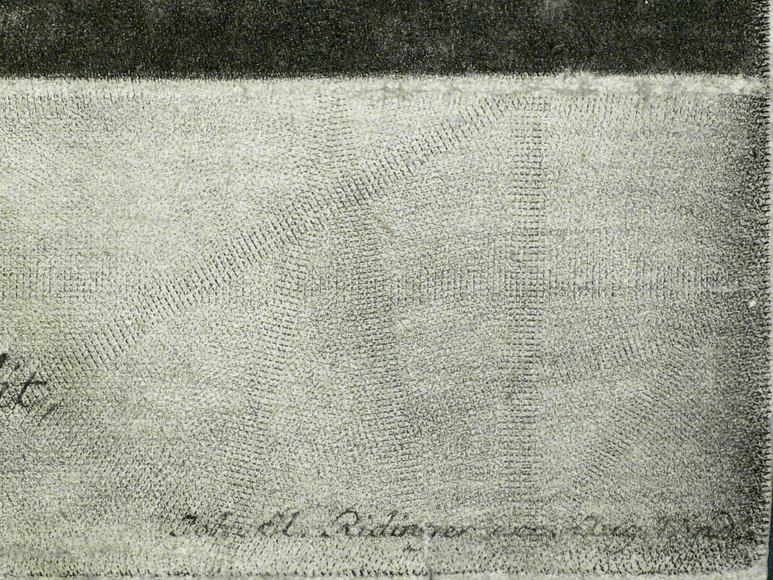 Schwarz 1461. Nicht bei Thienemann. – In der Platte unten rechts signiert. Unterhalb der Darstellung zwei kurze beschreibende Texte (deutsch/latein) in gebundener Rede: ″Der Neidische belauscht des treuen Schäfers Glück, / Warum wirfft Gifft und Gram sein tückisch Aug zurück? / Er quälet sich nur selbst, und jener darf nur lachen, / Kan er nur, wie er wünscht, sein Glück vollkommen machen.″ – Hübsche Schäferszene des Rokoko in einer weindurchrankten Grotte. Im Hintergrund die Herme eines Bacchus oder Satyrs. – Außerordentlich seltenes Blatt! Der in jeder Hinsicht hervorragend zu nennende Internet-Katalog zu Ridinger von Lüder H. Niemeyer verweist hinsichtlich der ″von altersher übergroße(n) Seltenheit seiner Schabblätter gerade auch gegenüber der verhältnismäßig vielfach noch sichtbaren Häufigkeit der herkömmlichen Kupfer″ auf Sandrart, der schon 1675 schrieb, dass geschabte Kupferplatten Auflagen von höchstens 50 bis 60 sauberen Abdrucken ermöglichen. – Blatt mit Lagerspuren, bis an die Plattenränder beschnitten. Fachmännisch restaurierter Einriss im unteren Rand. Verso Reste alter Montierung. Eher mäßig guter Zustand.