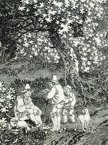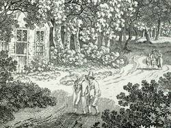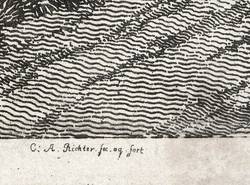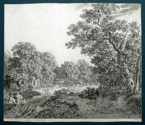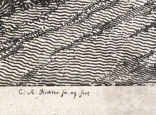 Links unterhalb der Darstellung signiert ″C. A. Richter fec. aq. fort.″ – Hübsche Darstellung einer offenen parkartigen Landschaft nach dem niederländischen Barockmaler Jacob van Ruisdael. Auch Richters Lehrer Adrian Zingg hatte, ein bis zwei Jahrzehnte früher, nach diesem Gemälde radiert, allerdings in etwas kleinerem Format, gewidmet seinem Freund dem Leipziger Druckerverleger und Kunsthändler Michael Huber (1727-1804). – Darstellung bis auf die Umfassungslinien beschnitten. Mangelhafter bis mäßig guter Zustand.
