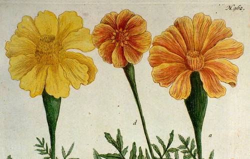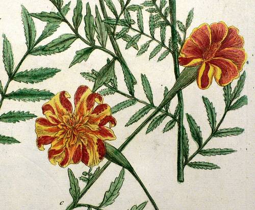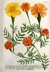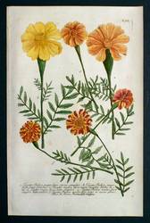 Aus: Johann Wilhelm Weinmann, Phytanthoza-Iconographia Oder Eigentliche Vorstellung Etlicher Tausend, So wohl Einheimisch- als Ausländischer, aus allen vier Welt-Theilen, in Verlauf vieler Jahre (...) gesammelter Pflantzen, Bäume, Stauden, Kräuter, Blumen, Früchten und Schwämme (Regensburg: Hieronymus Lentz 1737-1745), Bd. 3 (1742). – In der Platte rechts unten Signatur, rechts oben Tafel-Nr. "962", unten mittig ausführliche Inschrift: "a. Tagetes Indica major flore citrino simplici. b. Tagetes Indica major flore luteo simplici. c. Tagetes media flore aureo simplici limbo luteo. d. Tagetes media flore luteo simplici. e. Tagetes Indica media flore simplici luteo pallido. f. Tagetes Indica media flore luteo et aureo pleno, Fleur de Rome, Indianisch-Näglein." – Bei der Herstellung der Tafeln arbeiteten die Augsburger Künstler Bartholomäus Seutter, Johann Jakob Haid und Johann Elias Ridinger zusammen. Die Kupfer wurden in einer für die Zeit revolutionären Weise farbig gedruckt und sodann partiell von Hand koloriert. Dabei fand der von Seutter weiterentwickelte Mezzotinto-Farbdruck des Niederländers Johannes Teyler Anwendung. - Verbreitete Gartenpflanze, einige Arten sind auch als Gewürzpflanzen in Verwendung. – Das kräftige Büttenpapier sauber und frisch. Kontrastreiches wohlerhaltenes Kolorit. Insgesamt tadelloser Erhaltungszustand.