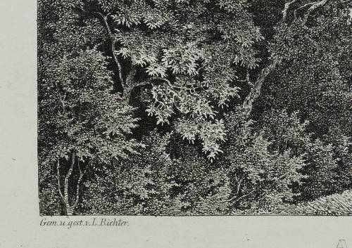 Kovalevski B-C 16. Hoff-Budde 191 II (von II). Hoff 155. – Aus: Bilderchronik des Sächsischen Kunstvereins (Dresden: Sächsischer Kunstverein 1828-1836). – In der Platte signiert unten links: ″Gem. u. gest. v. L. Richter.″ In der Mitte betitelt und bezeichnet ″Angekauft vom Sächs. Kunstvereine und bey der Verloosung 1829 gewonnen von dem Herrn Oberceremonienmeister Geheim-Rath von Preuss auf No. 208 ... ″ – Originalrandiges Exemplar im Randbereich schwach angeschmutzt. Insgesamt aber guter Erhaltungszustand.