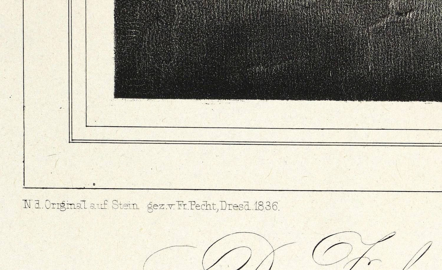Aus: Franz Seraph Hanfstaengl, Die vorzüglichsten Gemälde der königlichen Gallerie in Dresden (Dresden: Hanfstaengl 1836-1846). – Links unterhalb der Darstellung signiert und datiert: ″N. d. Original auf Stein gez. v. Fr. Pecht, Dresd. 1836.″ Mittig betitelt. Verlegeradresse und Trockenstempel der Königlichen Gemäldegalerie. – Gering Altersspuren im Rand. Sehr gute Erhaltung.
