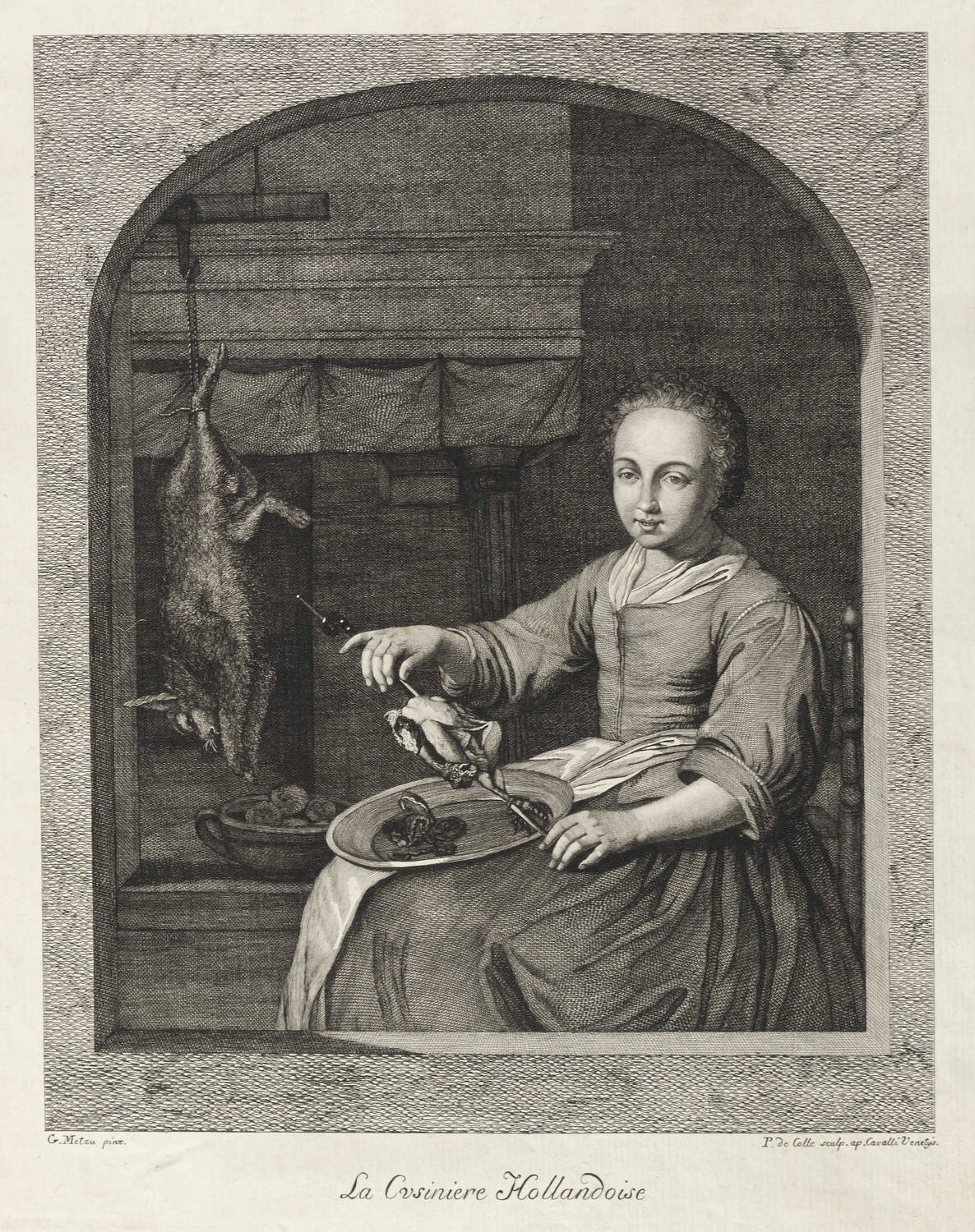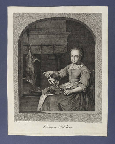 In der Platte rechts unten signiert: ″P. de Colle sculp. ap. Cavalli Venetijs.″ Darunter mittig betitelt: ″La Cusiniere Hollandoise″. – Papier altersbedingt etwas fleckig und oberflächlich leicht angeschmutzt. Insgesamt aber noch guter Zustand.