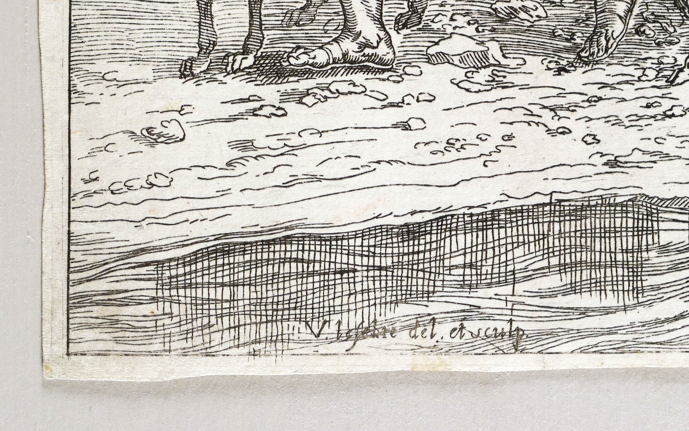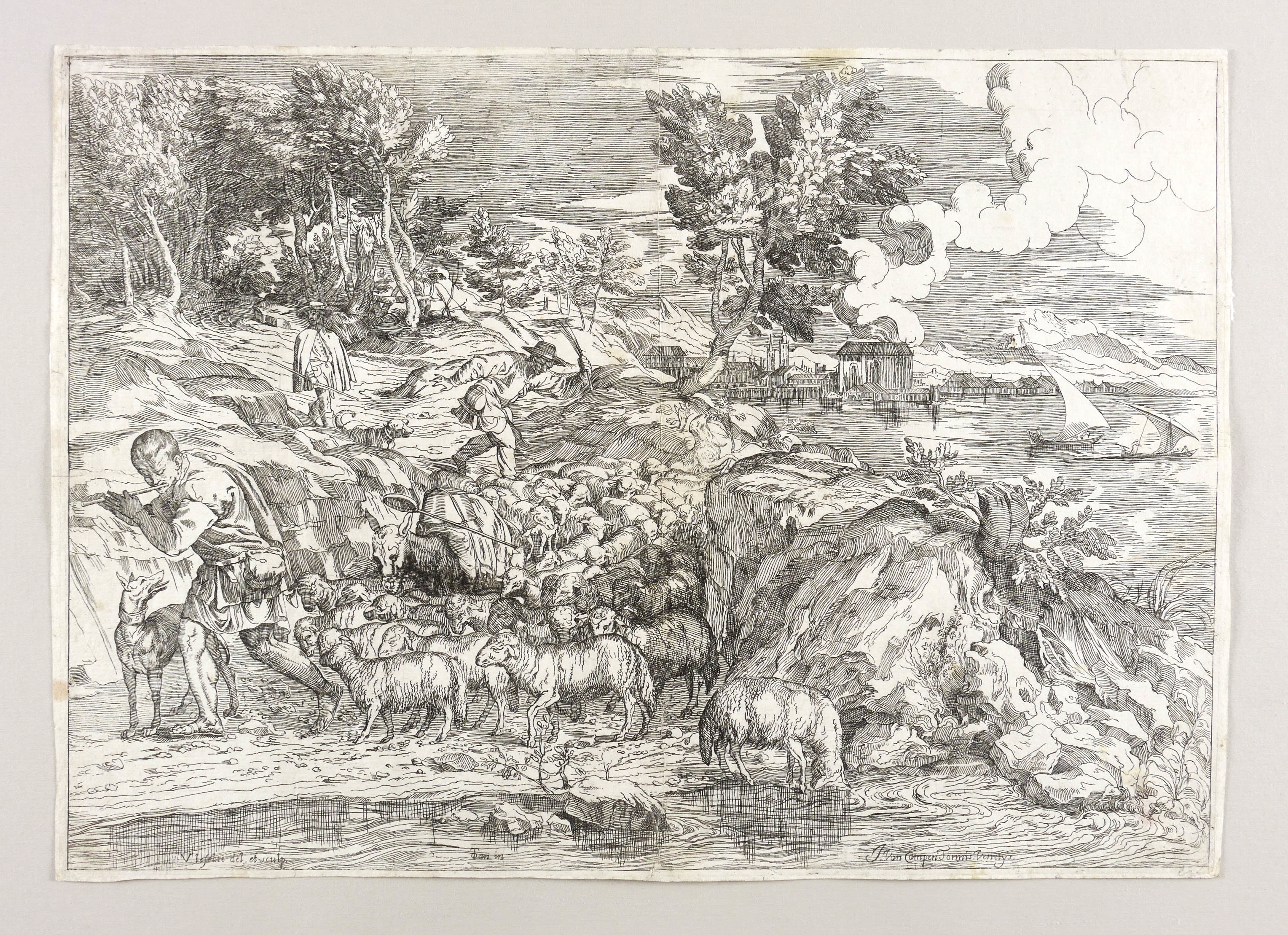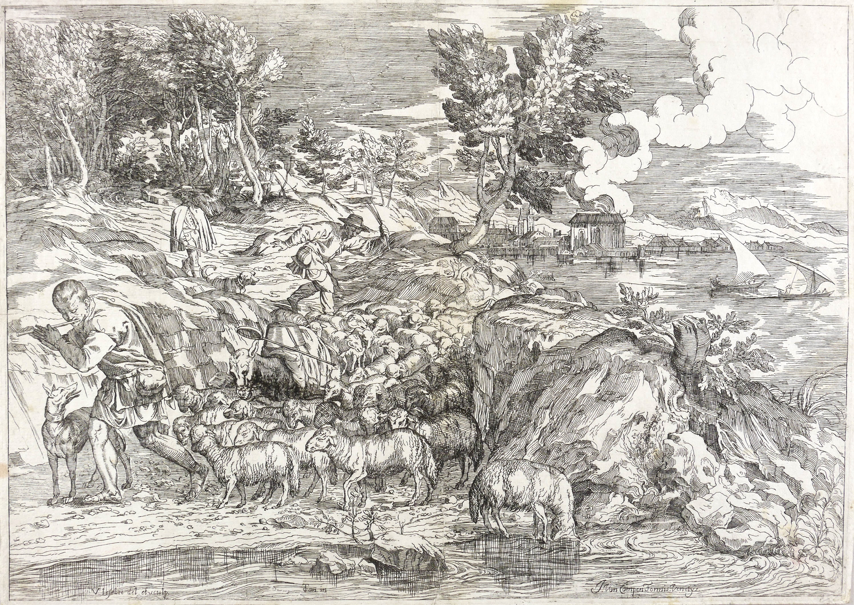 Aus: Opera selectiora, quae Titianus Vecellius Cadubriensis et Paulus Calliari Veronensis inventarunt ac pinxerunt (Amsterdam: Jacob van Campen 1682). – In der Platte links unten signiert: ″V. lefebre del. et sculp.″ Mittig bezeichnet: ″Tan in″. Rechts unten Verlegeradresse: ″J. Van Campen Formis Venetys.″ – Diese Radierung aus der 53-teiligen Folge ″Opera Selectiora″ gibt eine Federzeichnung Tizians wieder, die sich heute in der Albertina befindet (Inv. 1477). Vgl. zur Reproduktionsgrafik nach dieser Zeichnung Agnese Chiari (In: Saggi e memorie (16) 1988, A-21) und die Ausstellung ″Incisioni da Tiziano″ 1982 (Ausst.-Kat., Venedig 1982, Nr. 110). – Knappes Rändchen um die Plattenkante. Im Rand stärker beansprucht, etwas berieben und teilweise auch bestoßen. Ältere vertikale Knickfalte geglättet. Druckbild harmonisch und kontrastreich. Mäßig guter Zustand.