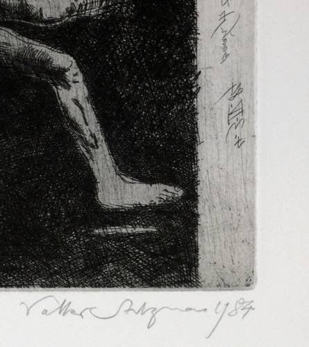 1984. Radierung / Strichätzung, in Schwarz, mit Plattenton, auf hellchamois Bütten. – Originale Künstlergrafik, von Volker Stelzmann. – Auflage Exemplar Nr. 4/8. – 50,0 x 32,0 cm (Darstellung / Platte), 79 x 55 cm (Blatt).